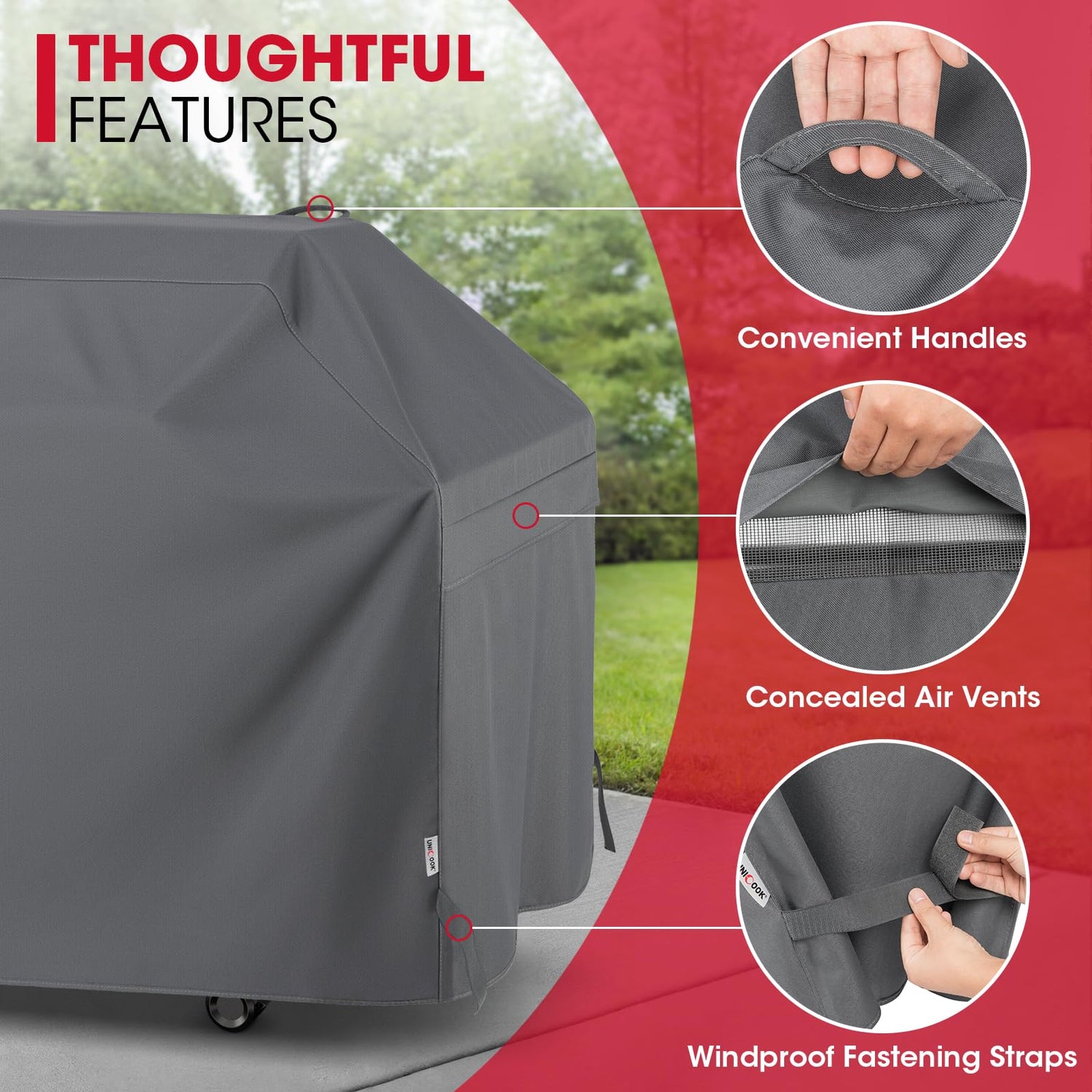 - Air Vents and Handles: Concealed wide mesh vents on both sides for air circulation and let moisture escape; Two sturdy fabric handles on the top of the grill cover allow you to install and remove the cover easily; Also can work as loops to hang up at side when not in use