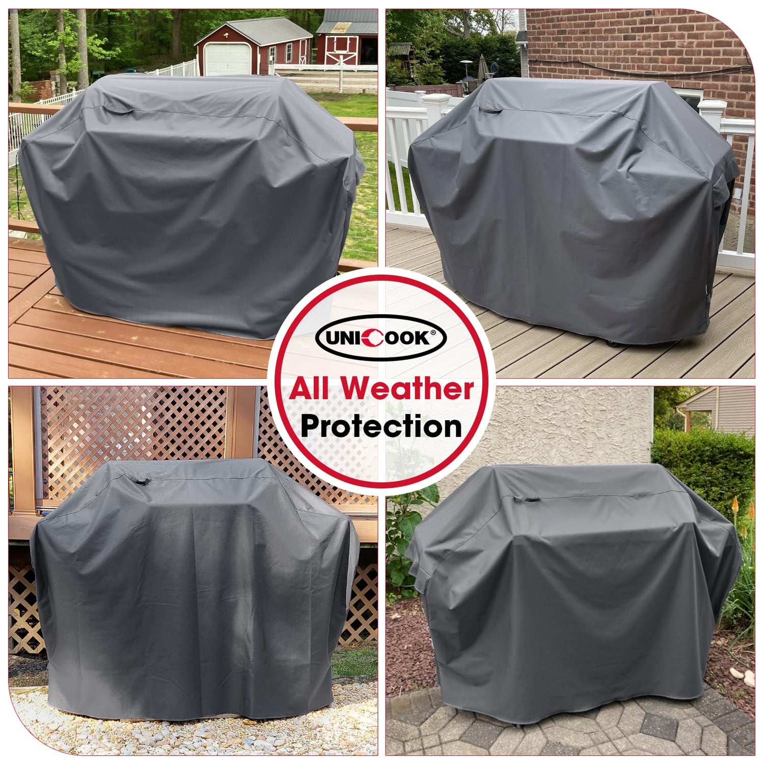 - Fade Resistant Grill Cover: Unicook heavy duty grill cover is constructed with fade resistant fabric with waterproof vinyl underlining, durable and long-lasting, protects your grills from outdoor elements of sun, rain, snow, wind, dust, dirt and etc through all seasons