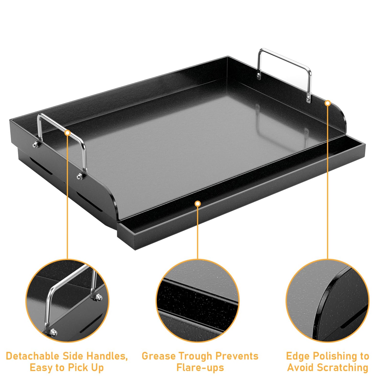 • Enhanced Features: 1. Upgraded Thickness: Prevents bending or warping during prolonged use. 2. Reinforced Support Ridges: Ensure stability and uniform heat distribution, eliminating hot spots and warping issues. 3. Detachable Handles: Convenient side handles make it easy to lift, carry, or store. 4. Built-In Grease Trough: Collects drippings to prevent flare-ups and makes cleanup effortless. 5. Polished Edges: Safe, smooth edges eliminate the risk of scratches during use