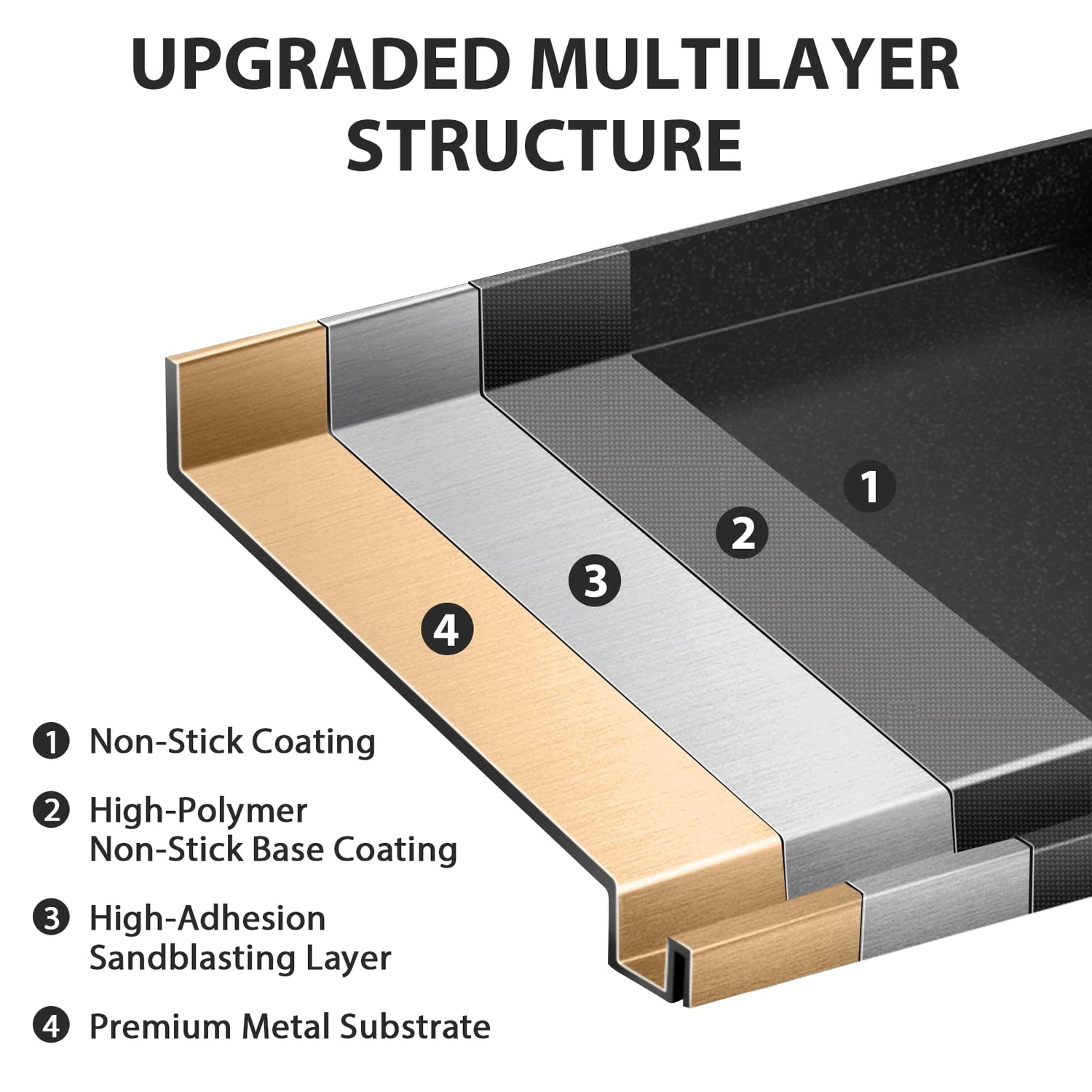 • Advanced Nano-Ceramic Coating for Superior Cooking: Our griddle features a cutting-edge nano-crystalline ceramic coating, designed for durability and convenience. The ultra-durable surface resists scratches and wear, keeping the griddle looking and performing like new even after extended use. This thick ceramic layer evenly distributes heat, eliminating hot spots for consistent, perfectly cooked meals every time