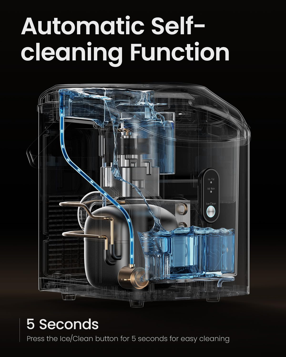 • Smart Self-Cleaning & Easy Maintenance | Hygienic Ice Every Time: Keep your sonic ice maker clean effortlessly with the 15-minute self-cleaning cycle. Featuring “Ice Full” and “Add Water” indicators, you’ll always know when it’s time to empty the basket or refill. The removable top cover allows for thorough cleaning, guaranteeing safe and fresh-tasting ice.