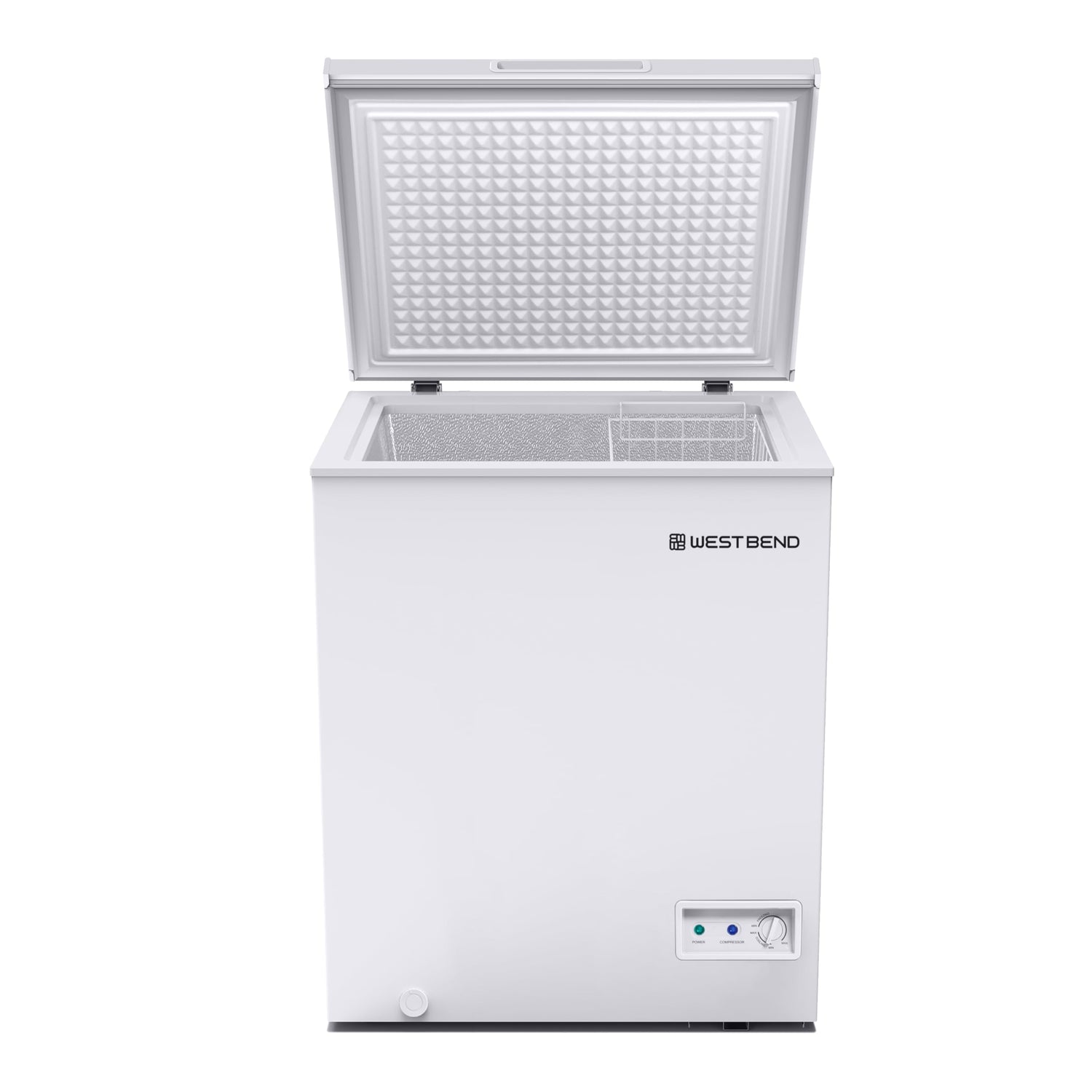 Details: Stock up on frozen foods to save time and money with the 5.0 cubic feet white deep freezer from West Bend. The perfect freezer fit for busy families, the ideal solution for households, cottages, offices, or any other location requiring additional storage space for frozen foods. This model features a single flip-up lid for easy access and convenient, removable storage basket to easily organize and quickly find your favorite frozen foods. The power indicator light lets you know your freezer is keeping your favorite items safely frozen, and you conserve energy with the easily-accessible adjustable temperature control. Manual defrost keeps your frozen food fresher and maintains a more consistent freezing temperature, while the defrost water drain conveniently removes water during defrosting.
