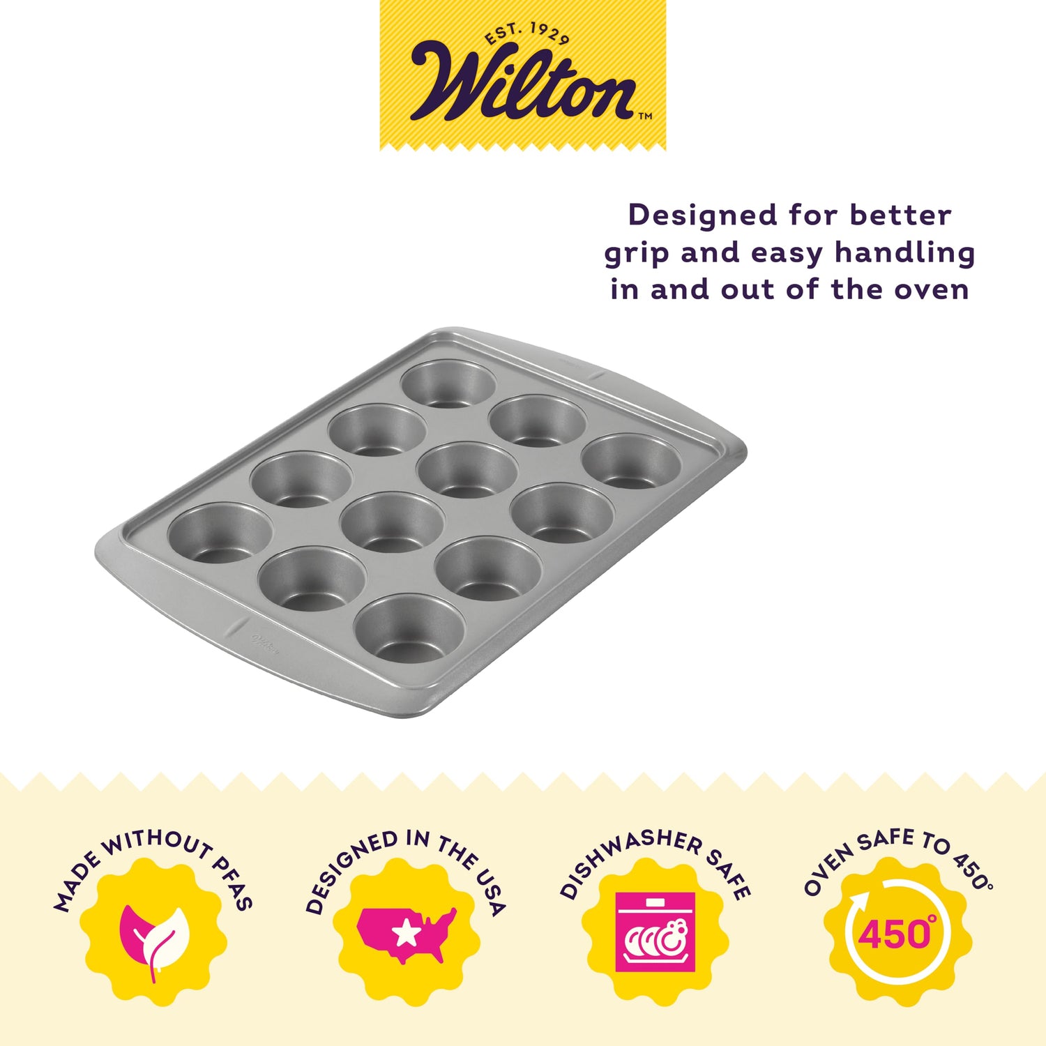 - Effortless Baking: Wilton muffin pan - nonstick, 12 cup, steel material, great for cupcakes, roasted veggies, egg cups, and more. Oversized handles for easy use.
