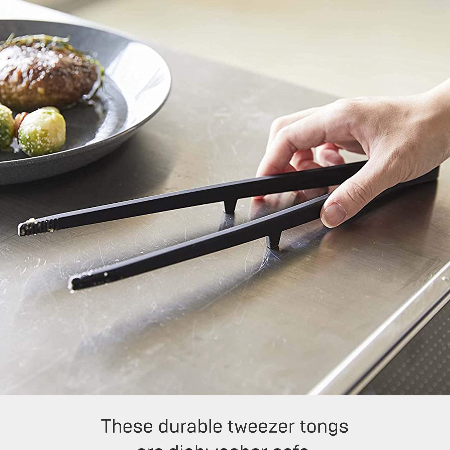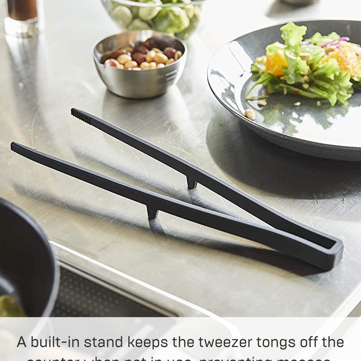 - [Durable floating tongs] Durable, lightweight, and easy to grip, tweezer tongs are designed for ease in the kitchen. A built-in stand keeps the ends off the counter when not in use, preventing messes.