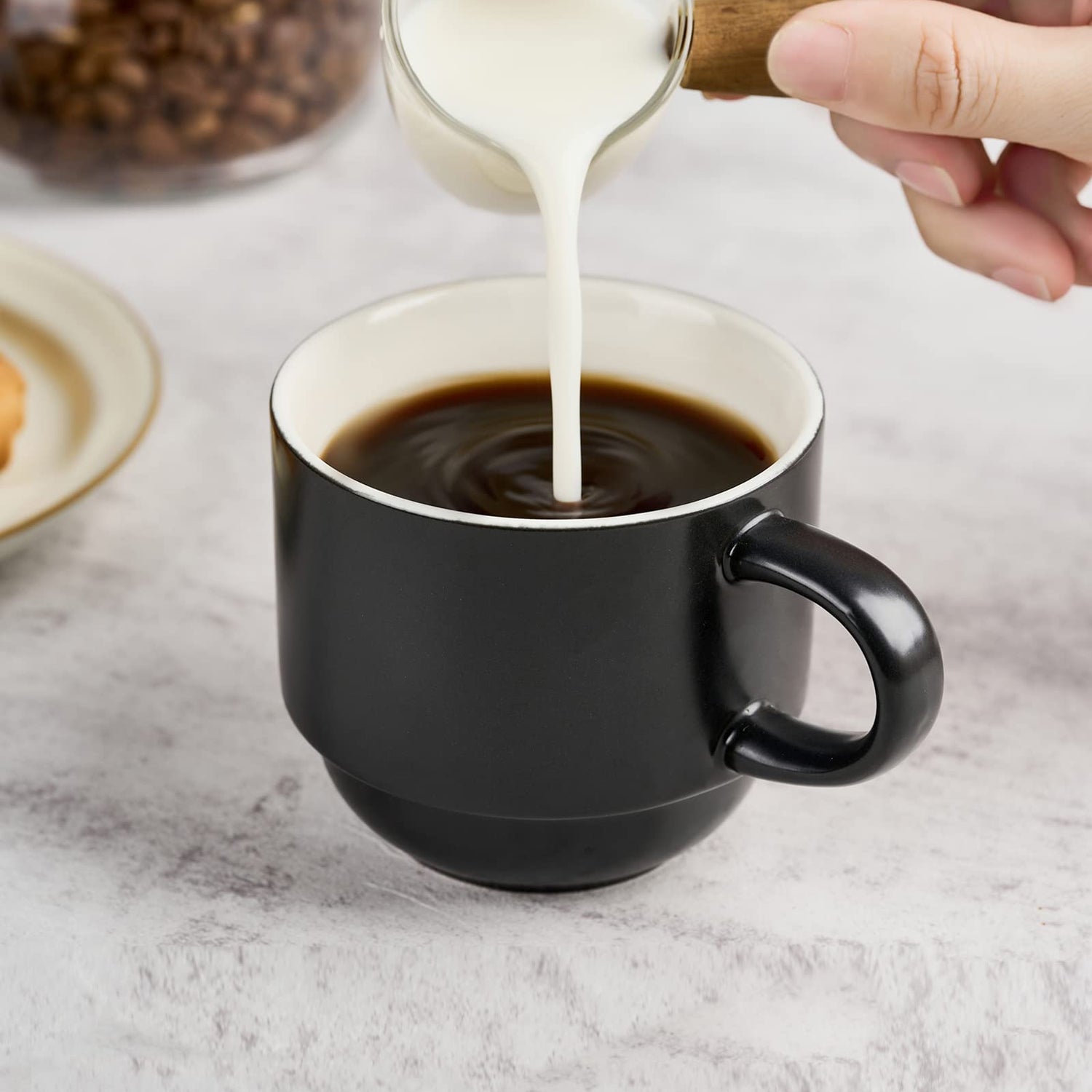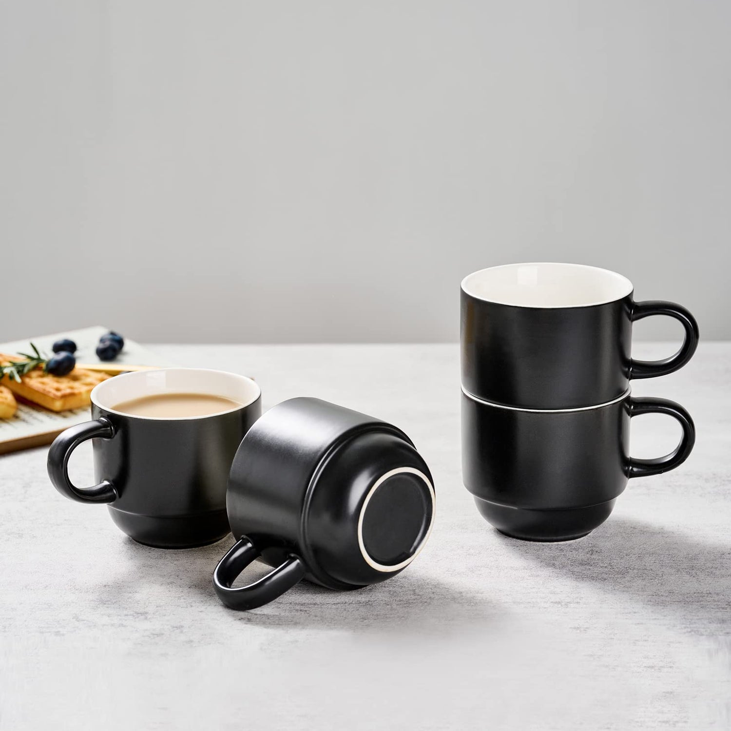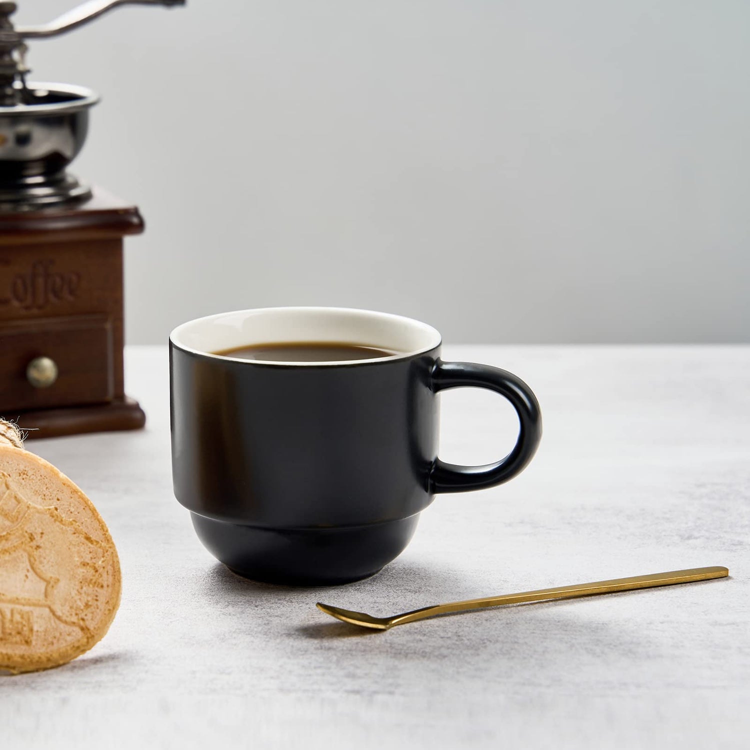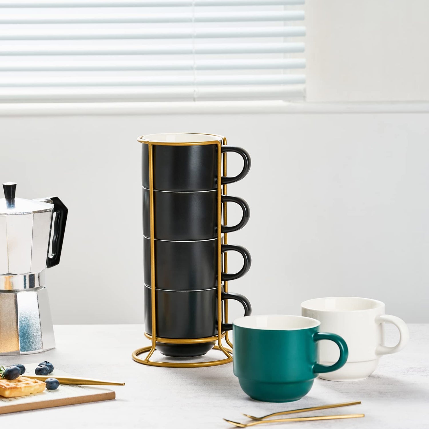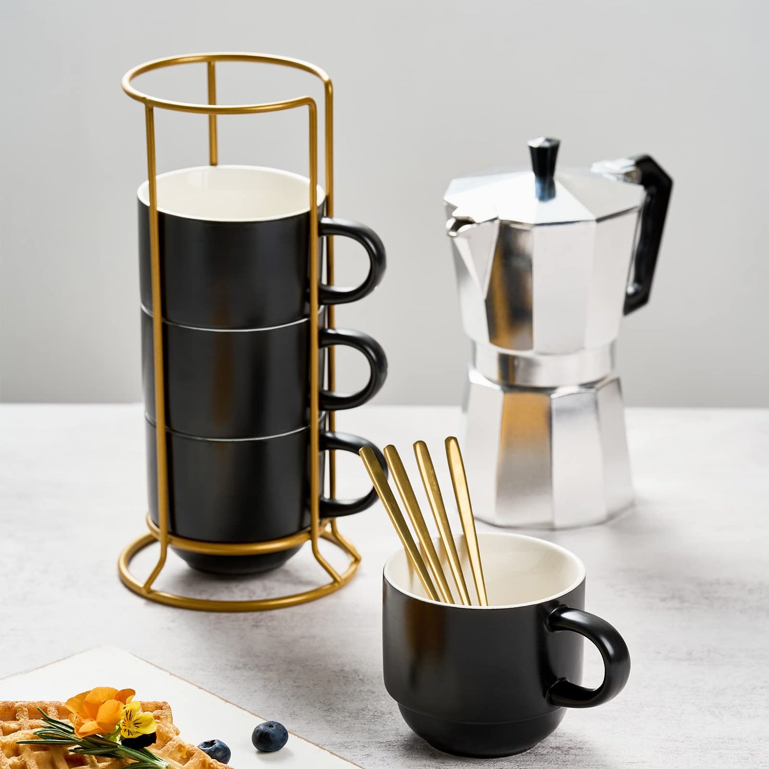YHOSSEUN Porcelain Stackable Coffee Mug Set With Rack, Demitasse Cups with Espresso Spoons, 11 Oz For Coffee Drinks, Latte, Macchiato, Cafe Mocha Set of 4,Black