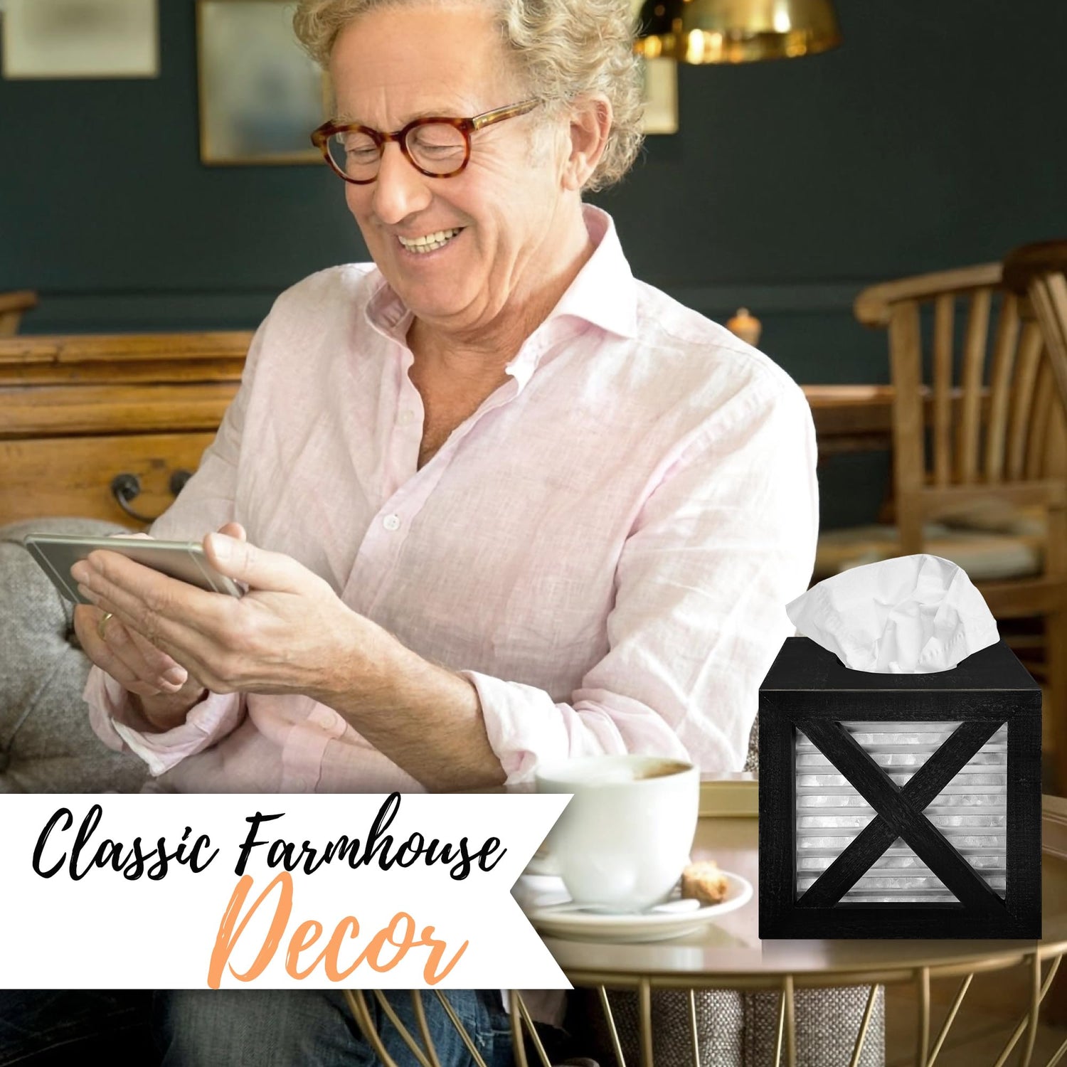 - 【Shabby Chic Charm】The popular barn door design in our galvanized kleenex holder for bathroom adds just the right rustic touch to your country home. The solid wood and metal dispenser makes this a quality piece that will grace your farmhouse kitchen, living room or bathroom for years. The larger cube tissue box, makes it very stable so you can dispense tissues from this wooden tissue box holder without any concern of it lifting up or toppling over.