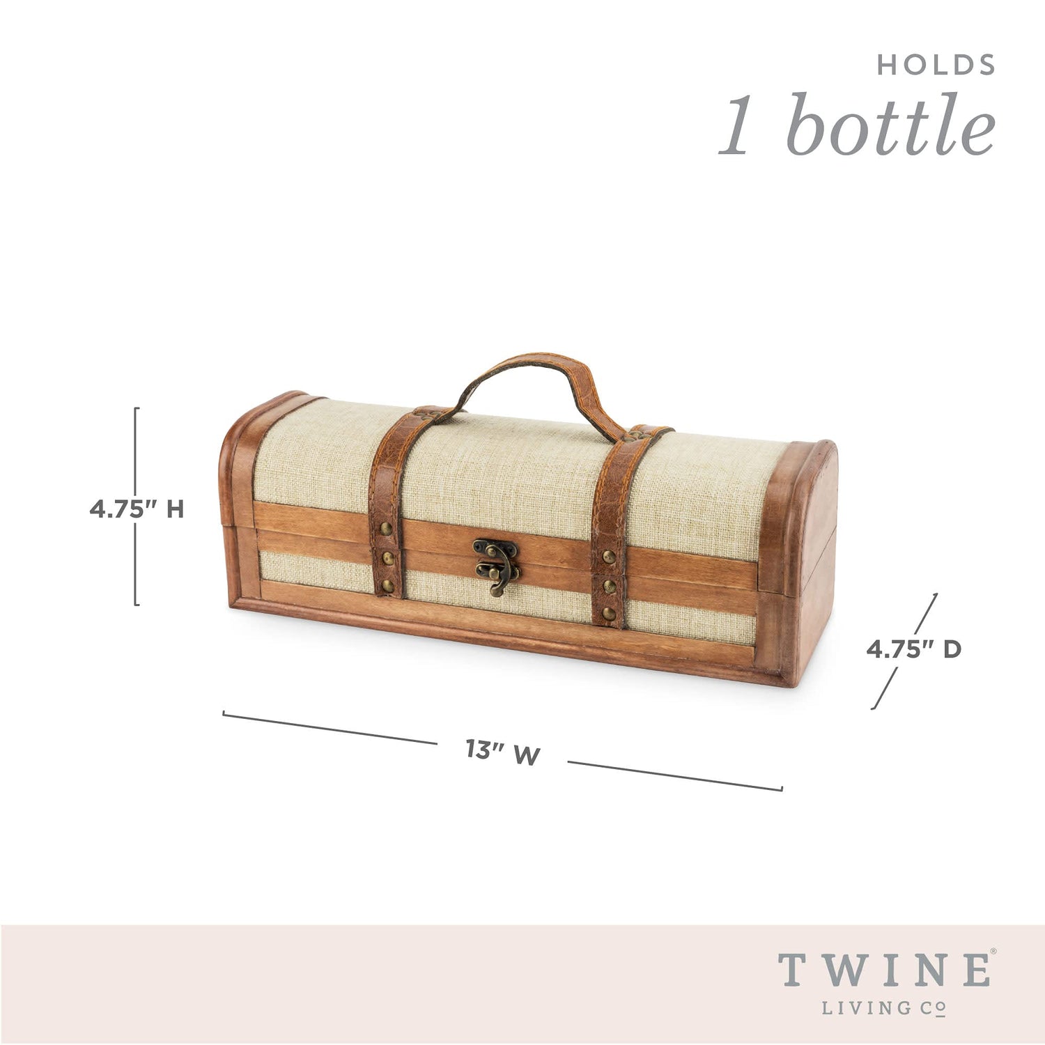 Twine Vintage Trunk Wine Bottle Gift Box, Wood Wine Box with Lid and Handle, Wood, Faux Leather, Brass, Cloth, Holds 1 Bottle