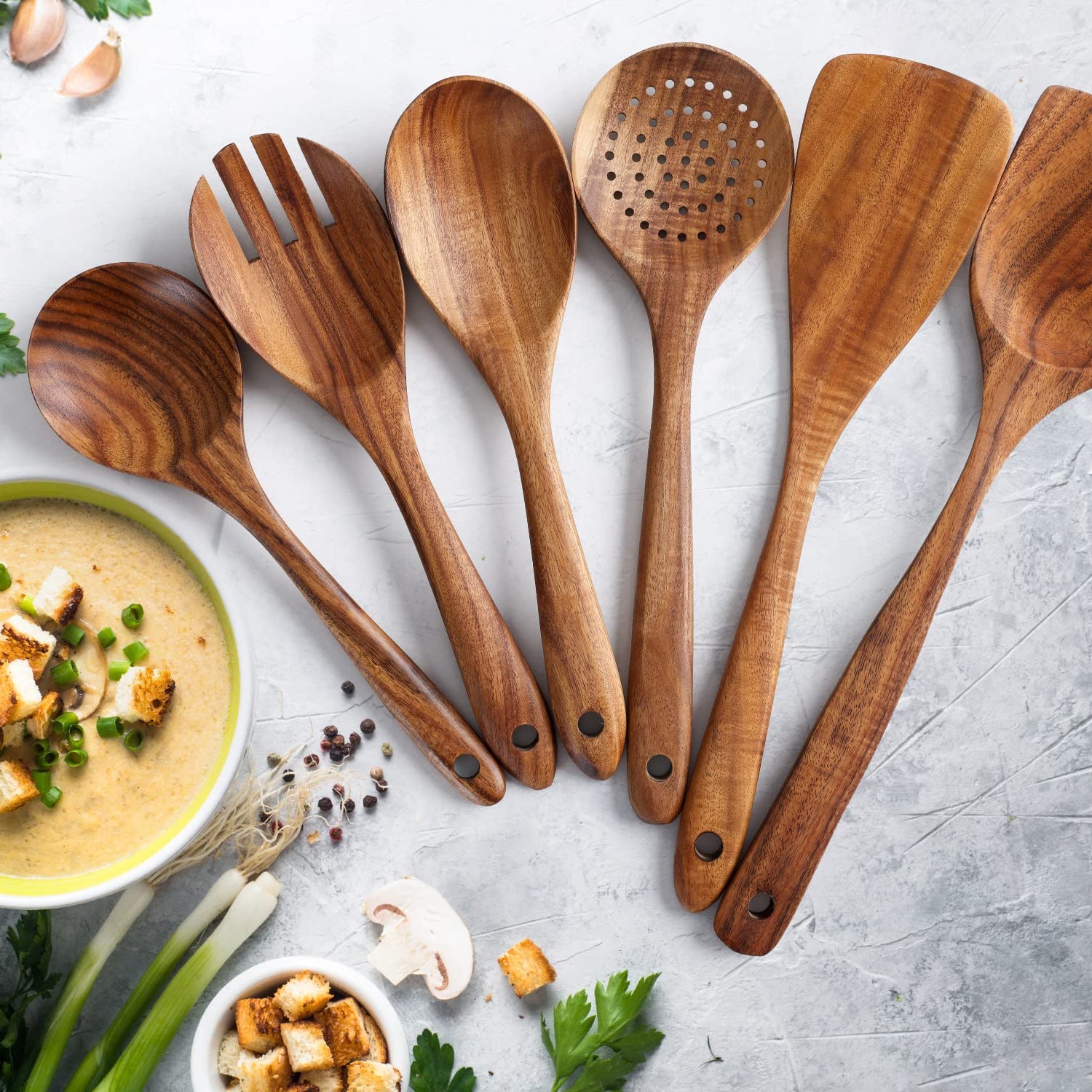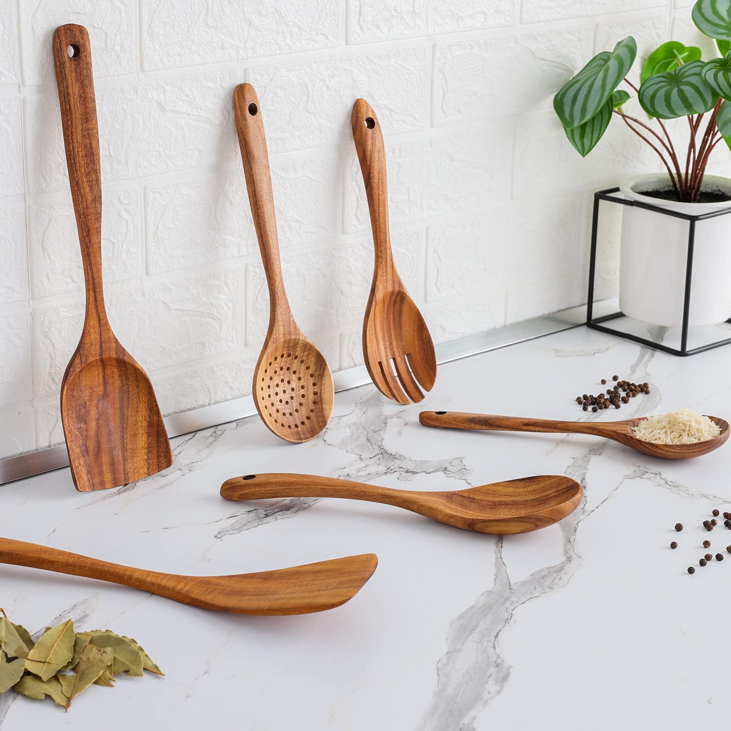 - IDEAL GIFT FOR COOKING ENTHUSIASTS: These Kitchen Utensils are beautifully crafted from teak wood which gives these Wooden Utensils an aesthetically pleasing ambiance to any kitchen. Great gift idea for Housewarming, Birthday, Christmas and Thanksgiving. Perfect for loved ones that like to cook, chefs or even for your own personal use. A perfect tool for freshening up or starting up your very own kitchen, a very attractive addition that will bring class and sophistication to your kitchen.