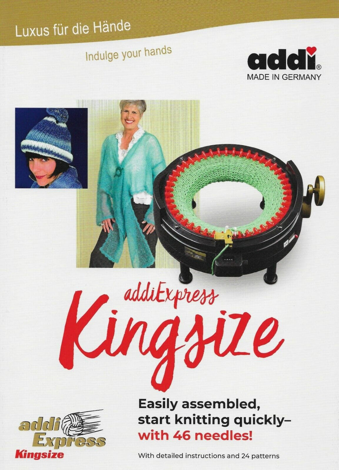 addi Express King Size Knitting Machine with 46 needles – for larger items such as hats, scarves, and garments addi Express Professional with 22 needles – suitable for smaller projects like socks or sleeves 2 replacement needle sets addi Express hook for manual adjustments Stopper set for secure positioning 3 instruction booklets: "Winding Instead of Knitting" "addi Express King Size" "Turbo Knitting 2"