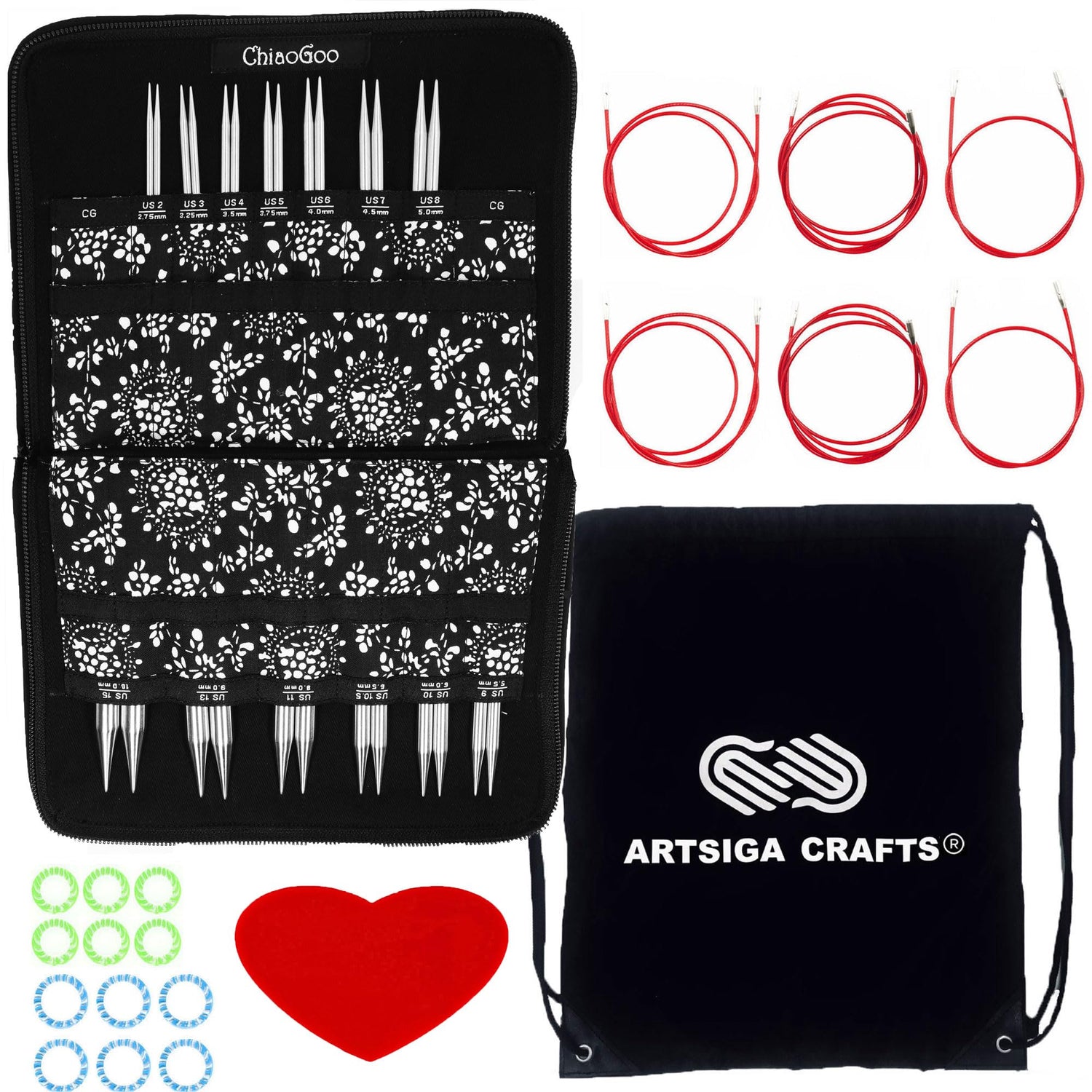 - Includes 1 ChiaoGoo Twist Red Lace Interchangeable Circular Knitting Needle Set Complete: US Sizes 2, 3, 4, 5, 6, 7, 8, 9, 10, 10.5, 11, 13, 15 (Metric 2.75, 3.25, 3.5, 3.75, 4.0, 4.5, 5.0, 5.5, 6.0, 6.5, 8.0, 9.0, 10mm) with 1 Craft Project Bag 7500-C