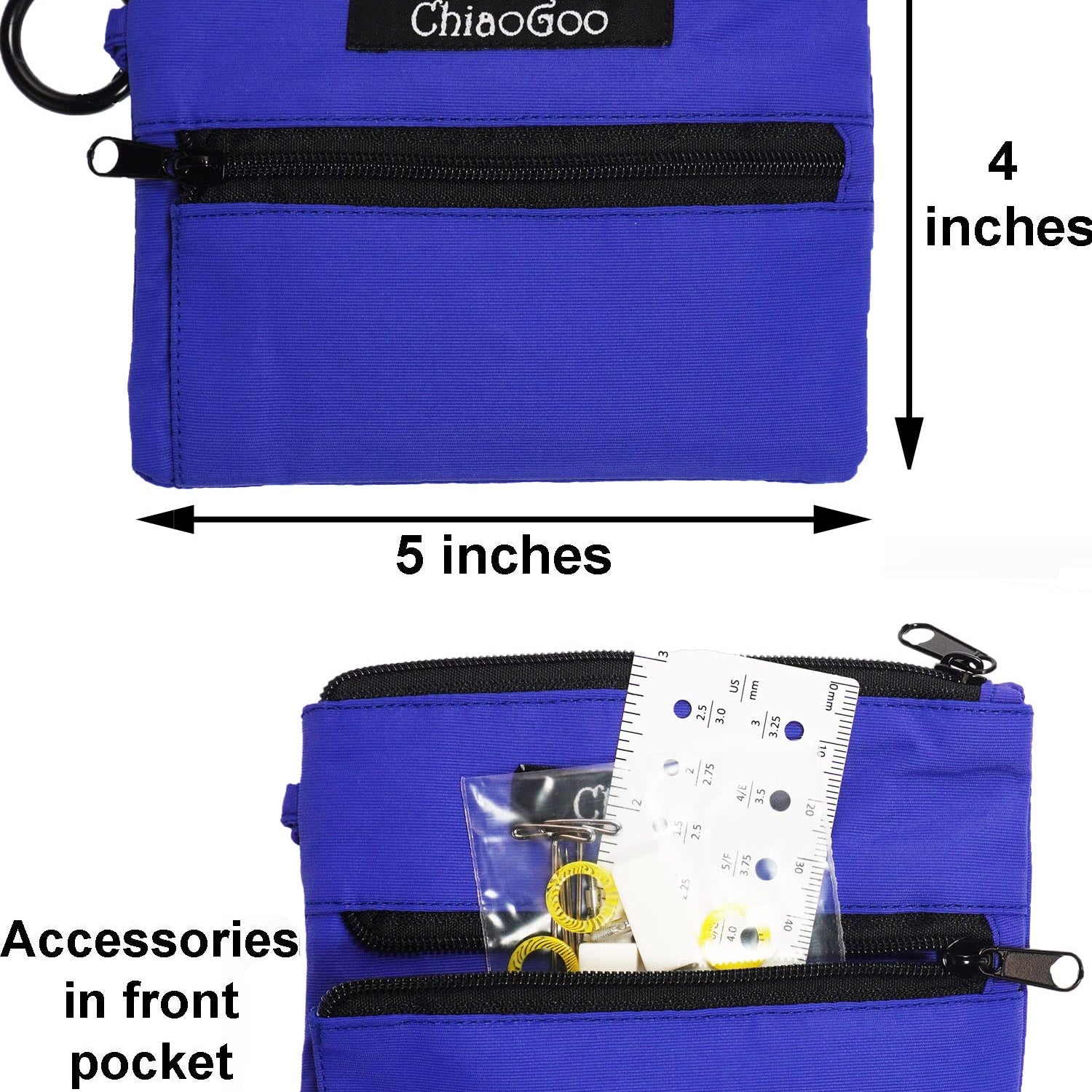 - Set also includes 2 tightening keys, needle gauge and 6 stitch markers and a stylish blue case with two zippered pockets