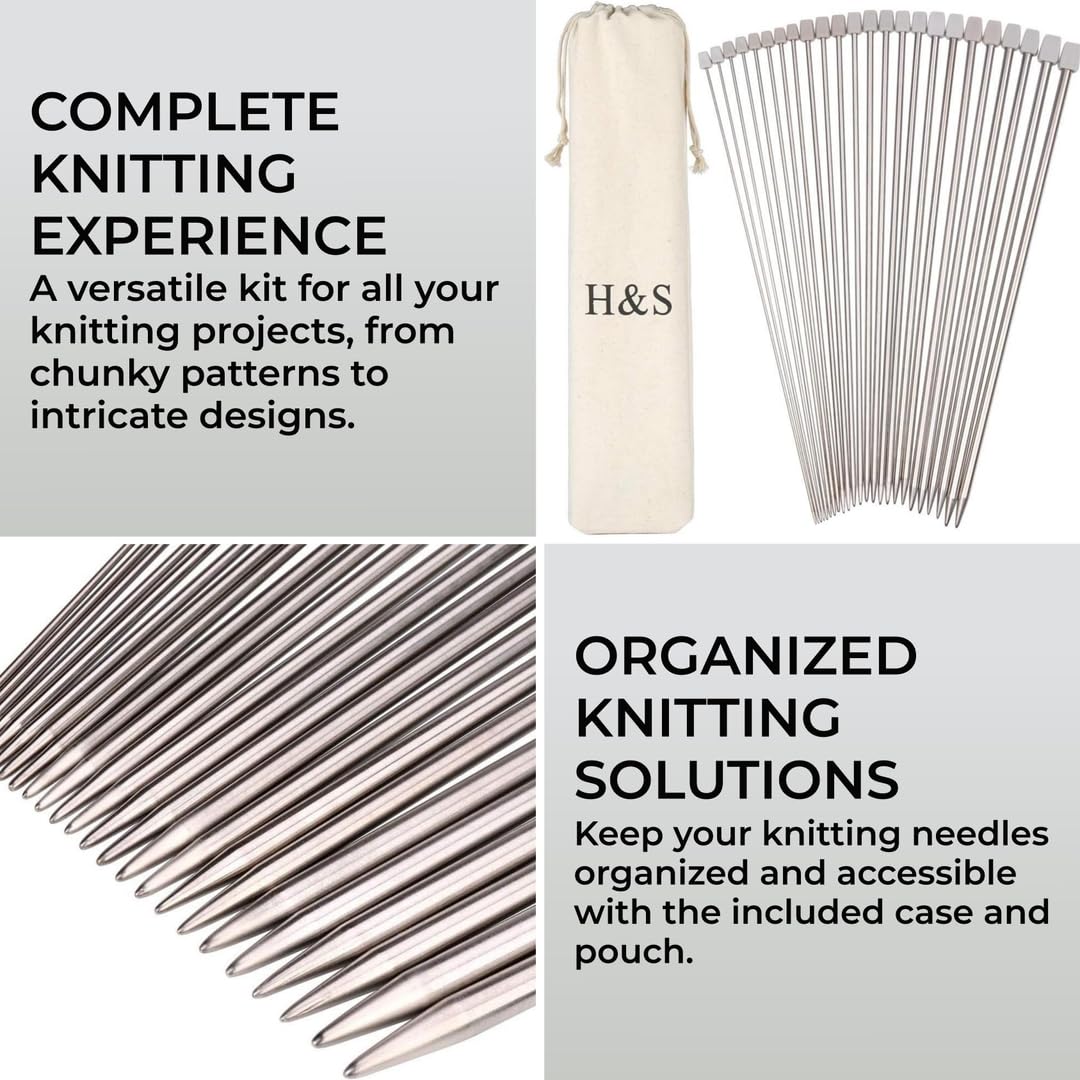 H&S Knitting Needles Set for Beginners Knitting Accessories - 11 Pairs of Stainless Steel Knitting Needles with Firm Grip Handle - Single Pointed Needle Set with Pouch for Easy Storage