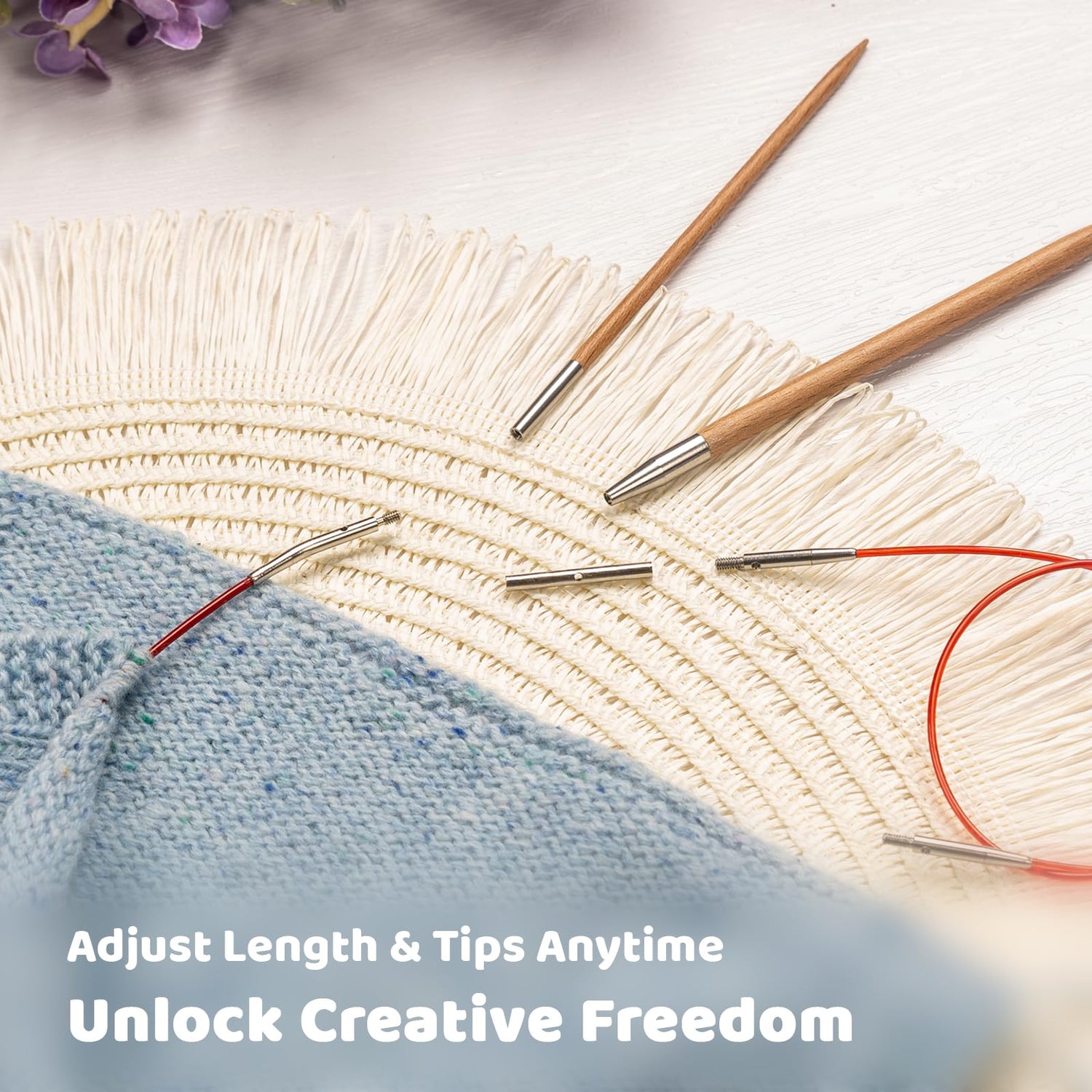 Details: Premium Beechwood & Steel Interchangeable Knitting Needles Set - 10 Sizes (3.5-10.0mm) with 4 Cables & Navy Blue Leather Case | Double-Lock Ergonomic Design