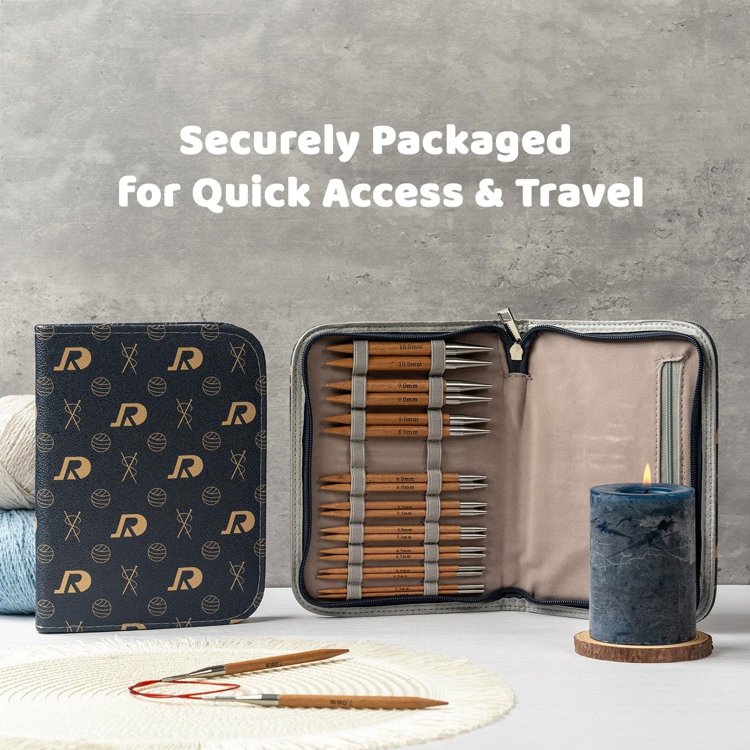 - Sophisticated navy blue leather case with embossed size labels keeps 10 needle pairs, 4 cables (12.6"-21.6"), and tools elegantly organized. Includes a non-slip pad and matte black ruler for professional stitch measurement