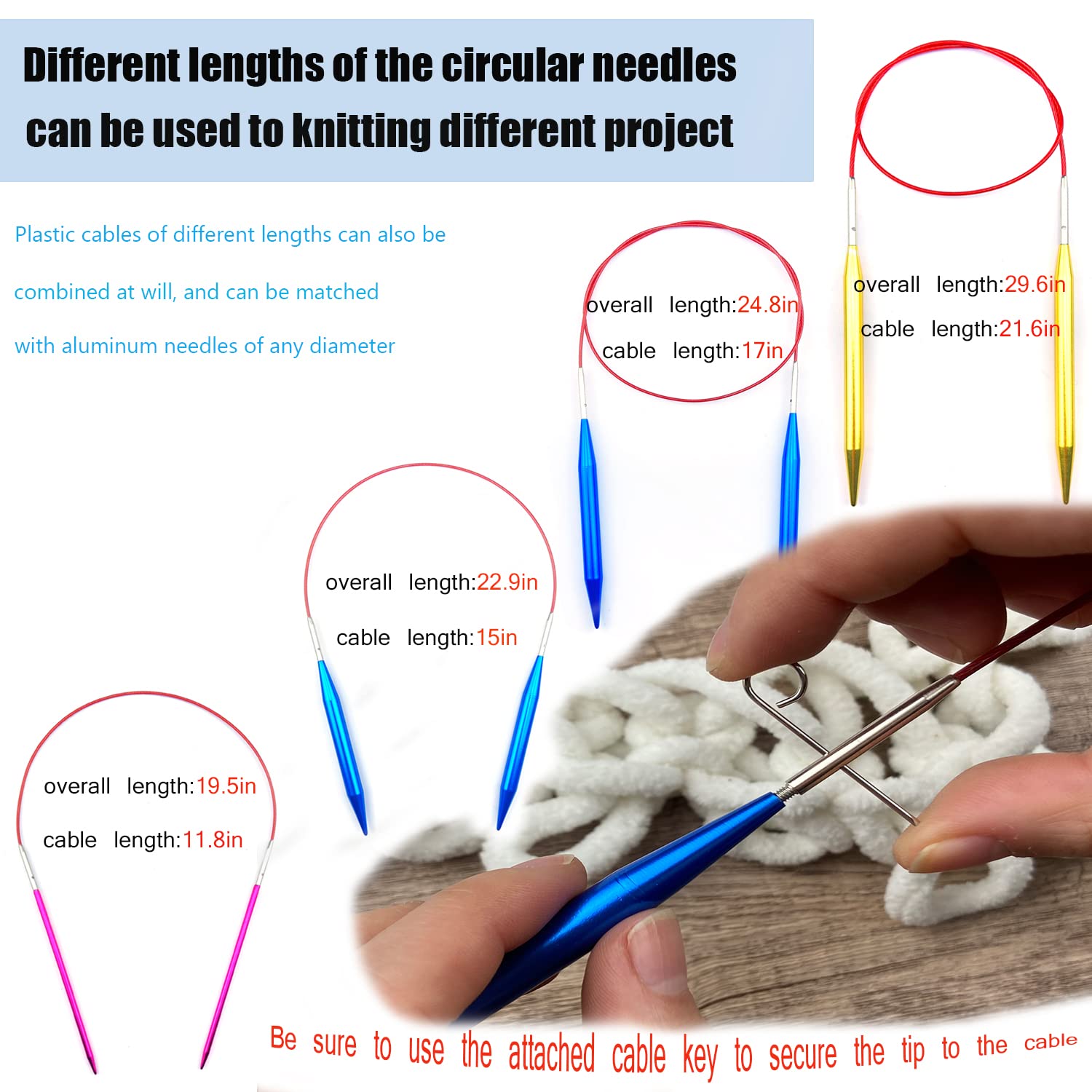 - In this knitting needles set,you are freely to combine any size and length you want to meet the size of the project you need to knit.Be Sure to Use the Attached Tightening Key to Secure the Tip to the Cable,As You Casting on,the Needles Keep Won't Come Unscrewed from the Cord