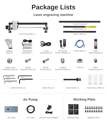 - 【Easy Installation】LASER TREE 10 W laser cutter kit includes laser machine, air assist pump, and Desktop Protection Magnetic Plate. All spare parts have been pre-packed into small clear polybags and detailed illustration has also been printed on our attached User Manual. This will help you complete the whole installation process correctly and quickly. Laser Engraver Machine for Beginners