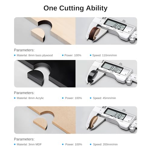 - 【Efficent Engraving & Cutting】Laser module uses the latest LD+FAC+C-Lens compression spot technology, fixed focus, and focal length is only 45mm. Directly engraving mirror stainless steel: no need to paint black; Super fast engraving speed: 304 stainless steel, up to 300mm/s with 45mm focus length; And remarkable cutting ability: cutting through 8mm thickness plywood by one pass at a speed of 1.5mm/s with 45mm focus length. Working Area: 300x300mm.