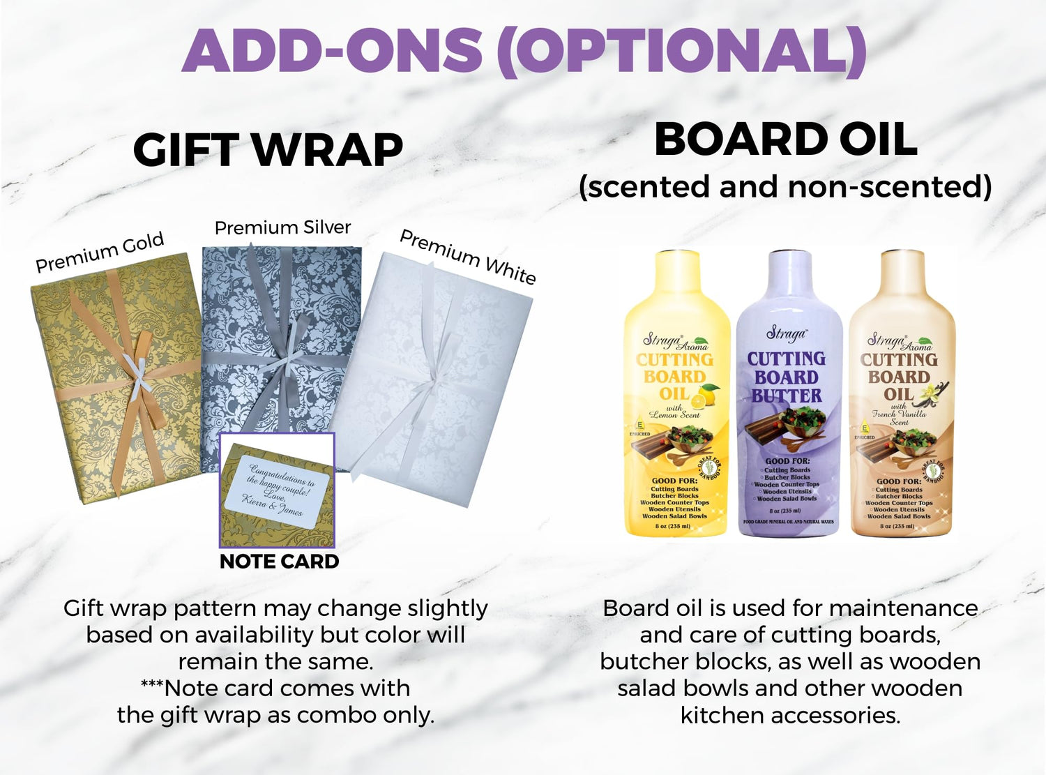 Each and every board is made from a high grade natural wood. All boards are made by us in our own shop and carefully checked prior to the engraving process. Personalization is achieved by using the state of the art laser engraver. Last, but not least, each board is completed by application of Straga Cutting Board Butter for the board's protection; therefore, you get a fine-looking FINISHED cutting board!