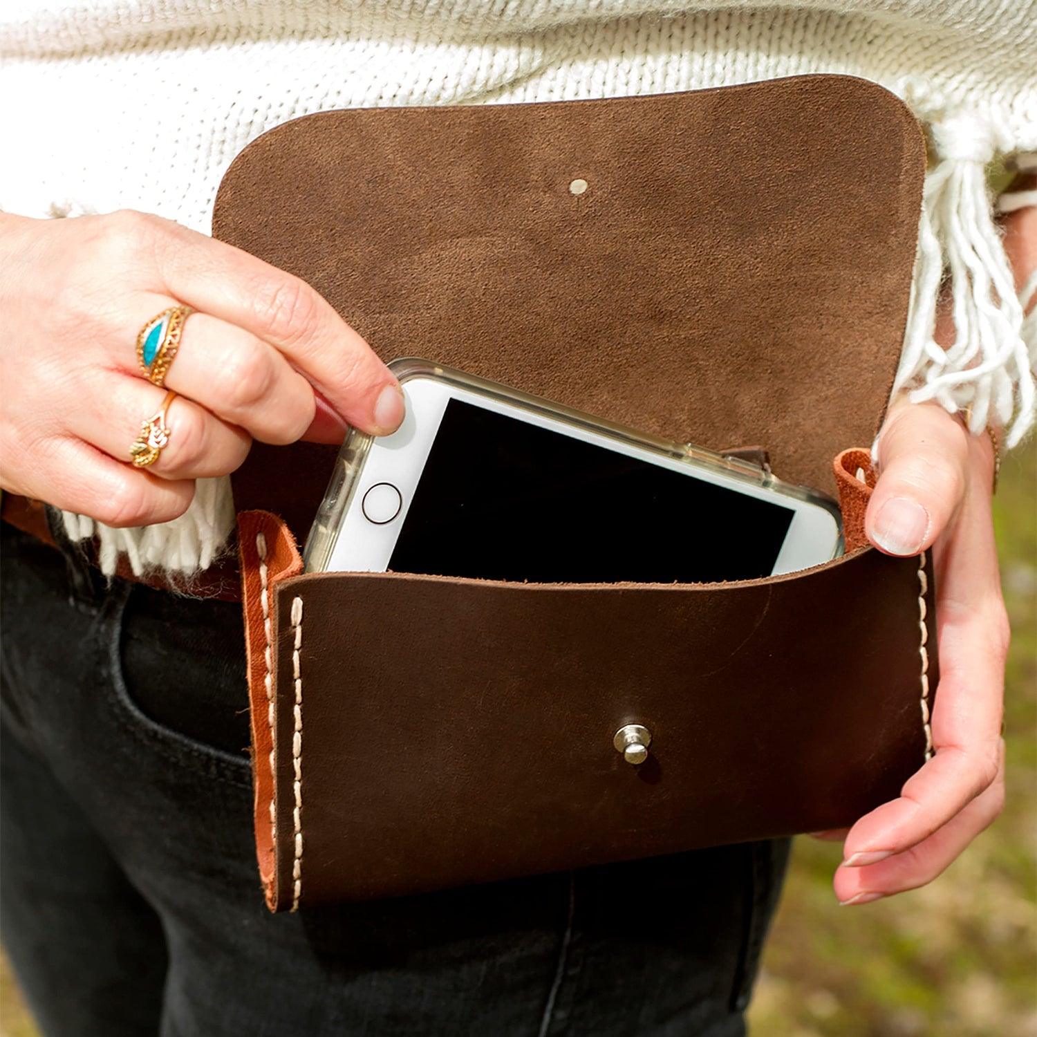 Details: Make your own belt bag with the Festival Belt Bag Kit. The main pieces of leather are cut from dark brown triumph leather with accent pieces cut from the medium brown. Leave the kit as is or decorate to create a unique design. The finished size is 2" x 5.8" x 10".