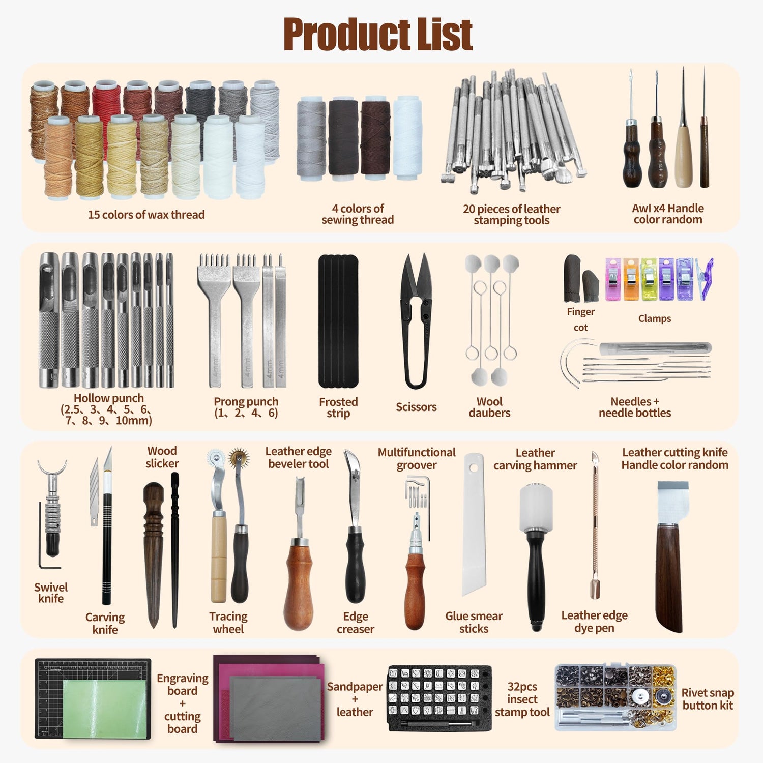 - ABOUT THE PRODUCT:Our leather kits have a certain degree of professionalism, the tools are very comprehensive, for you to consider a lot of details, just this one big toolkit, all your needs can all be solved. We not only equip you with all common carving tools, but also with carving mats and cutting mats to minimize damage to your workbench. One toolkit can meet all your engraving, cutting, punching, sewing and stamping needs, with all kinds of needles, threads and buttons