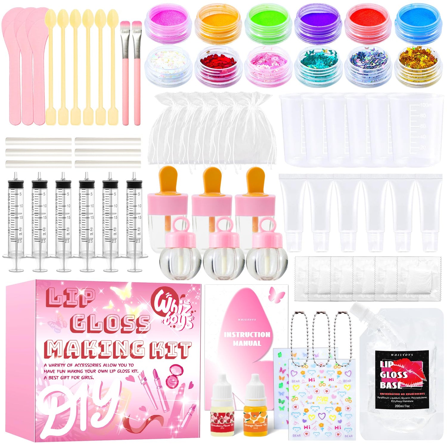 WhizToys DIY Lip Gloss Making Kit 74 PCS, Pink Kids Lip Gloss Supplies Set Beginner, Fun Craft Set Moisturizing Base, Birthday Gift Set for Girls, Kids, Teenagers, Women