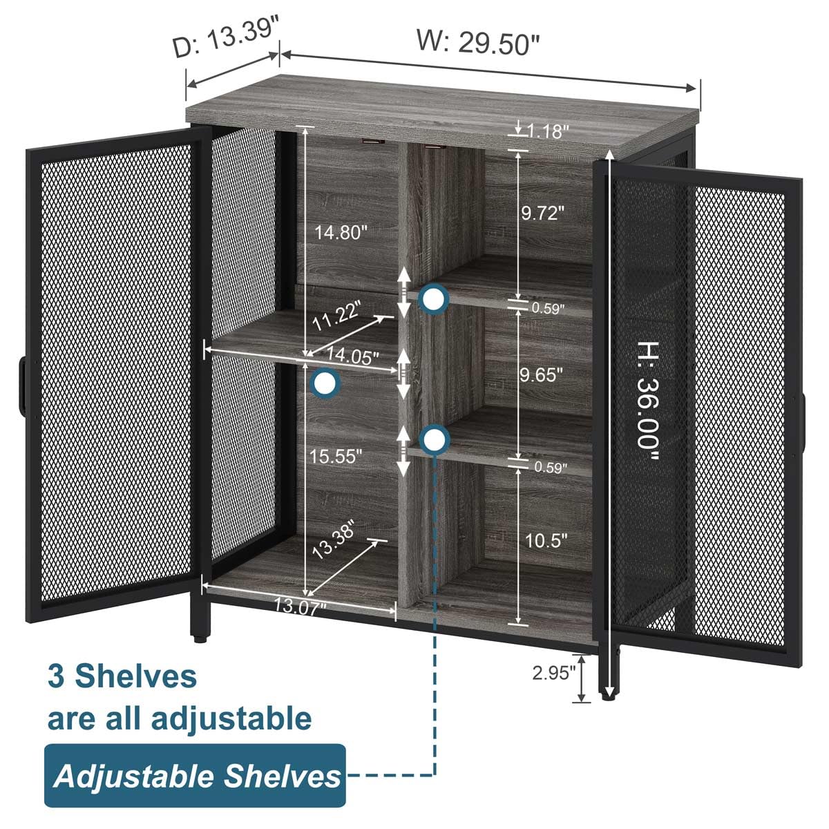 - Dimensions and Material: 29.53"W x 13.39"D x 36.00"H. Crafted from high-quality MDF board with rustic oak wood grain finished that adds farmhouse touch to your home. We also use powder coating to seal up the steel and the metal of this storage cabinet won’t rust over time.
