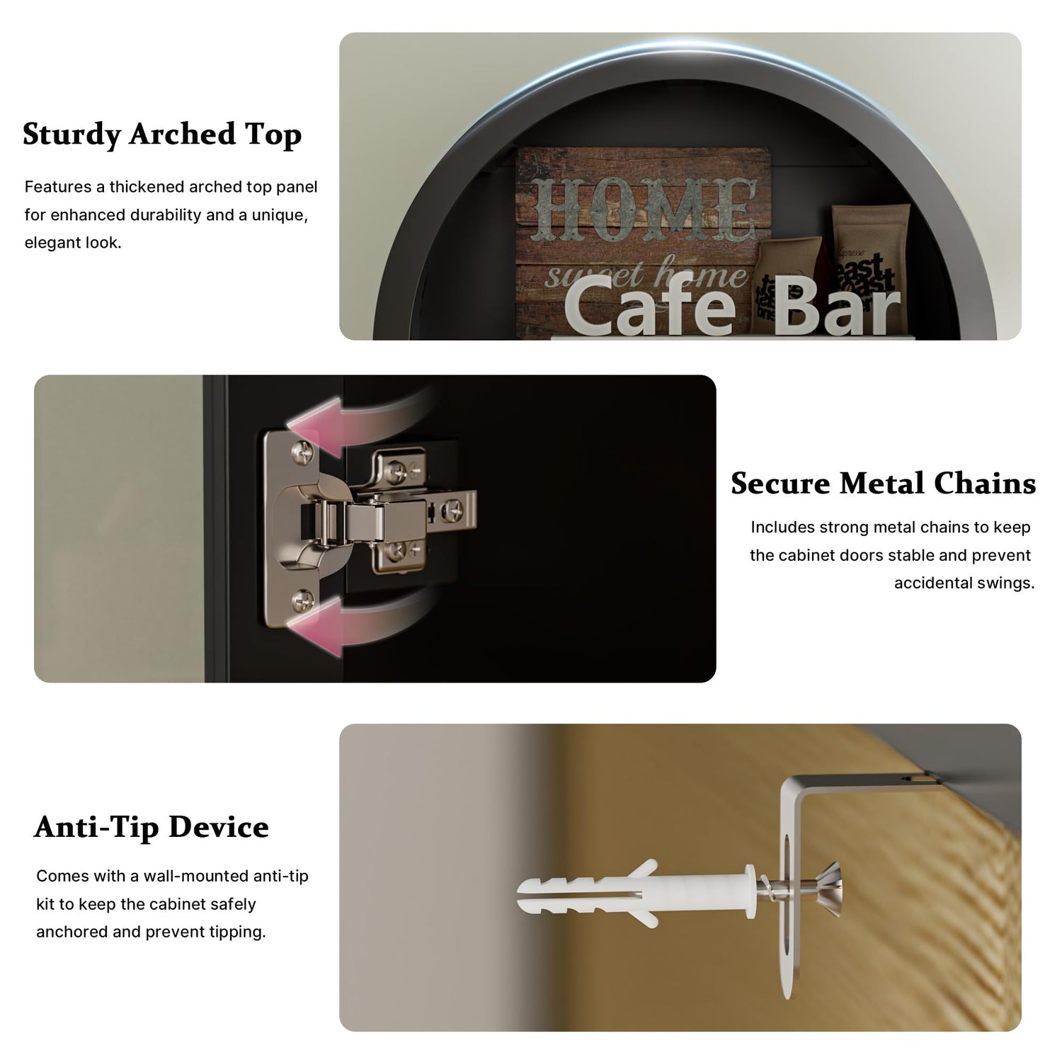 - Easy to Clean: Designed with elevated wooden legs, this arch cabinet leaves 5.1" of clearance from the floor—making it easy to vacuum or mop underneath, a key convenience for pet owners or busy households