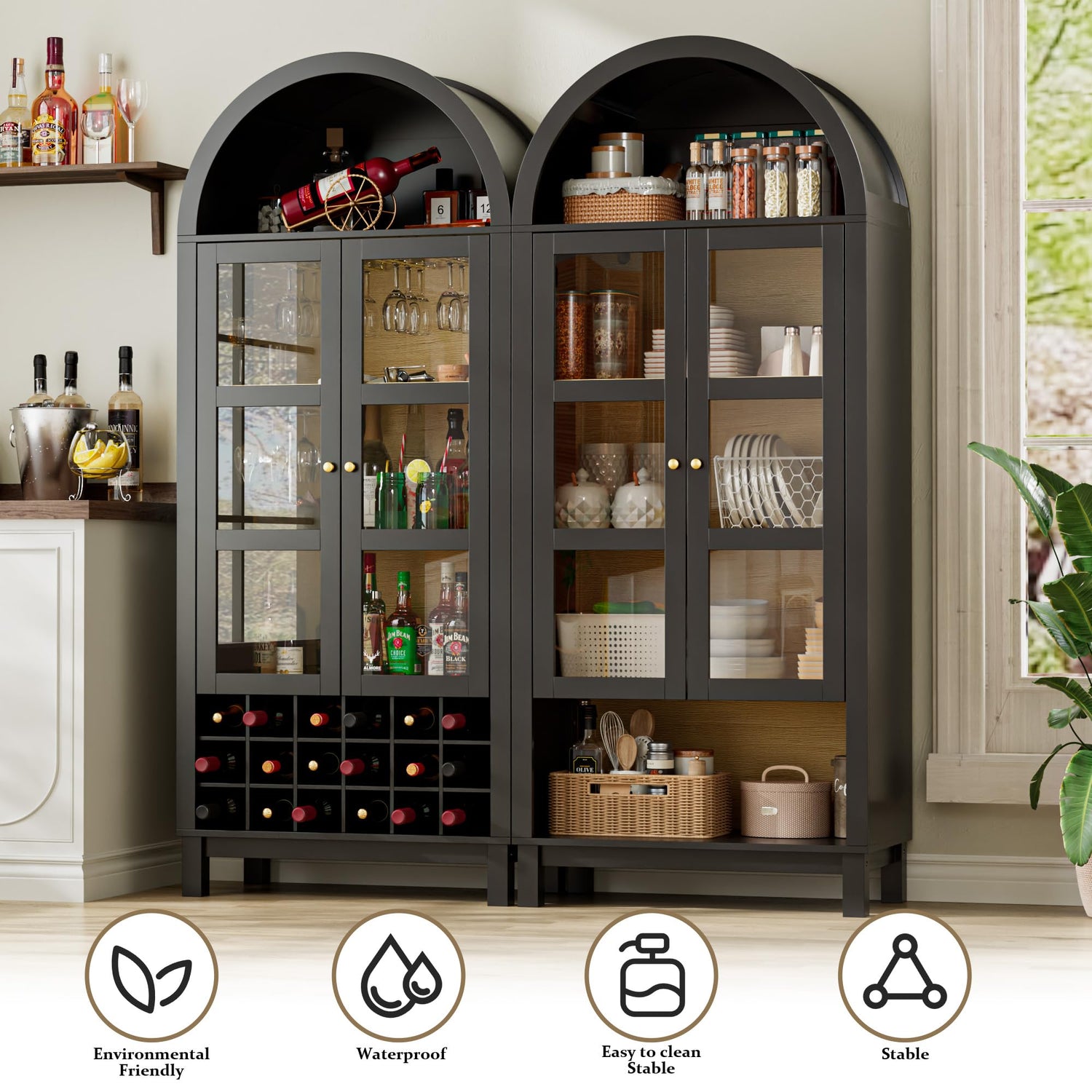 - Durable & Stylish Design: The tempered glass doors protect your items from dust while providing a clear view of your collection. Crafted with pine wood and a sturdy frame, this tall arched cabinet offers long-lasting durability for use in dining rooms, living rooms, or home bars