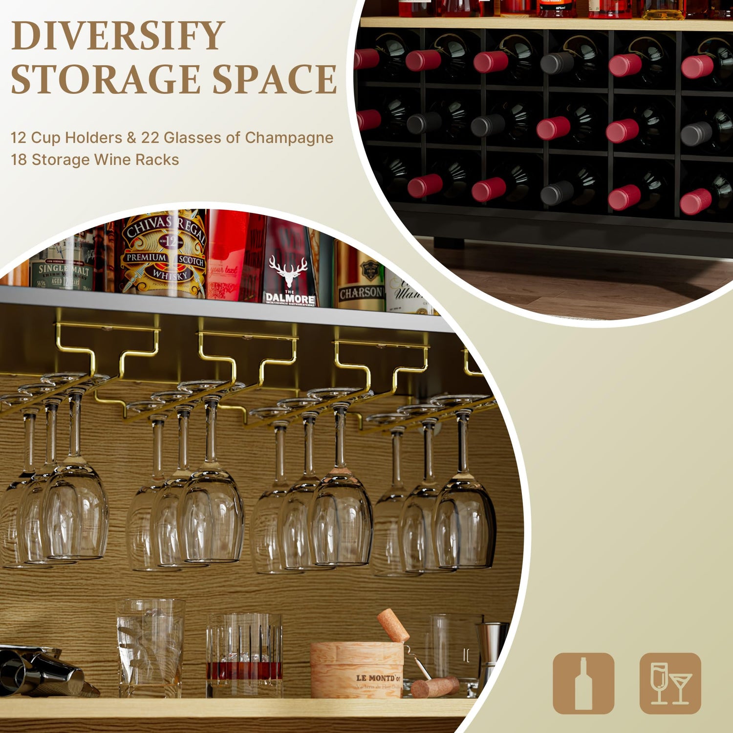 - Safe & Easy Assembly: For peace of mind, this whiskey cabinet includes a built-in anti-tipping device, ensuring stability and safety, and comes with all necessary components for quick and hassle-free assembly. Enhance your home’s décor with this bar cabinet