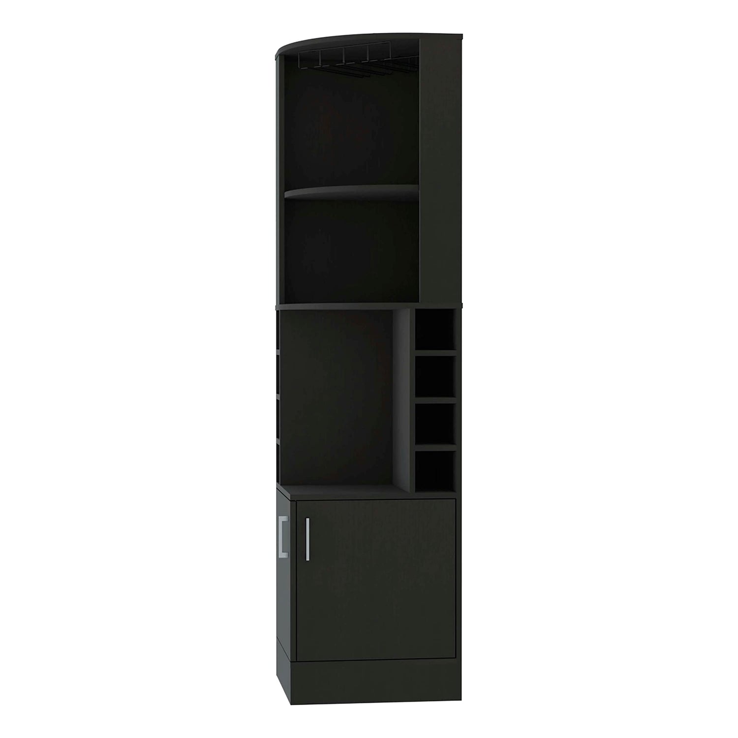 Details: The Delhi Corner Bar Cabinet is the perfect solution for those who want to complete their bar set and spruce up a dull corner simultaneously. Product size (71,1'' H X 18,4''W X 18,4''D)The sleek cabinet features multiple shelves, a glass rack, and eight wine cubbies (4,4'' X 4,4''), providing ample storage for all of your bar supplies. Whether hosting a party or just enjoying a night in, the Kava Delhi Corner Bar Cabinet will make your experience more enjoyable. So go ahead and invite your friends over for drinks – your new bar cabinet is ready to impress. Designed with elegant Black manufactured wood finish