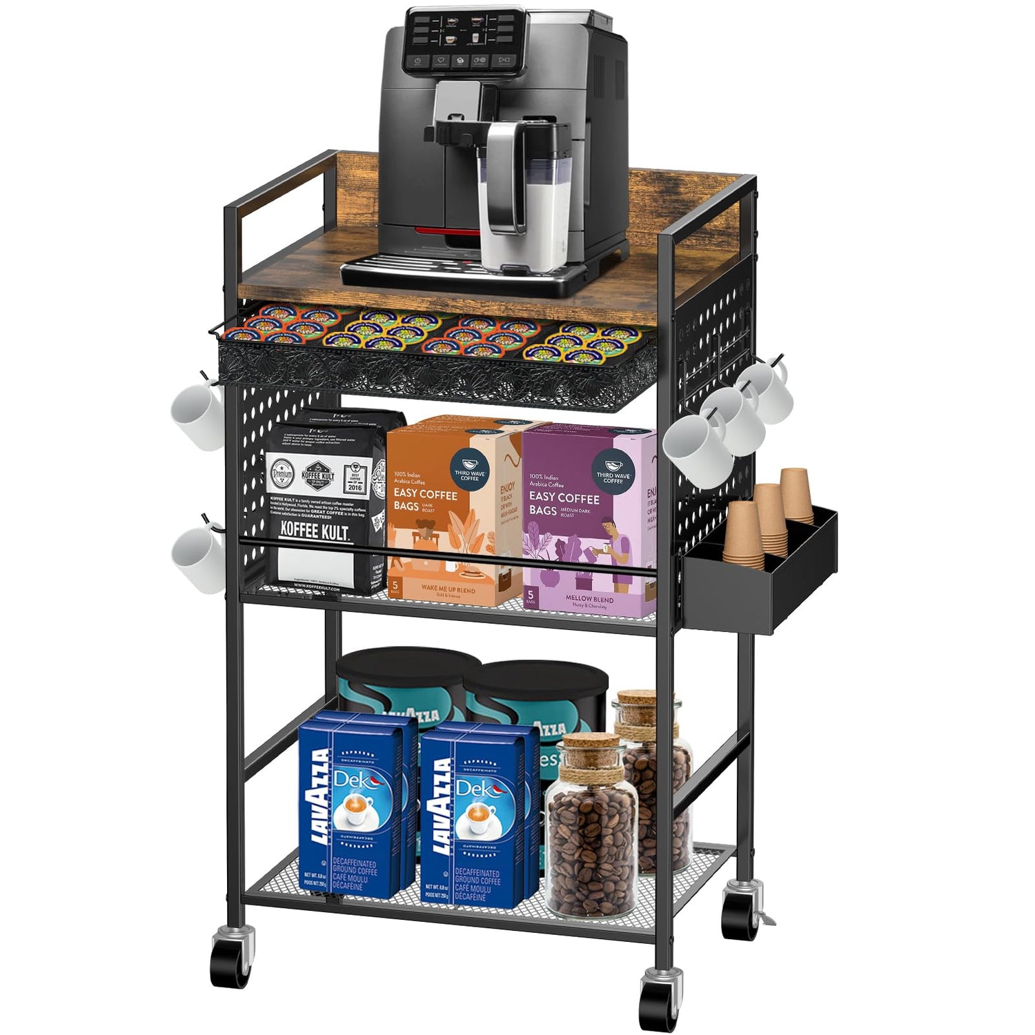 - Durable and Stable:The coffee rack is made of high-quality materials, each layer can bear 30 pounds, the high-quality metal frame enhances the stability of the coffee rack, and the iron mesh fence with an anti-oxidation coating on the surface ensures that it will not rust during use and prevent items from falling.
