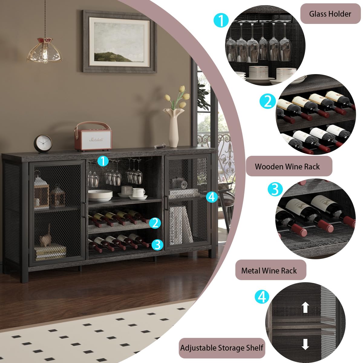 - Super Large Capacity : The spacious bar top is perfect to showcase coffee makers, cups, plates, fruit trays or even favorite decor. While, the wine rack table features two mesh doors that open to reveal shelved storage, the removable shelf can fit your different needs. 2 sets of removable wine racks plus 1 set of wooden wine rack and glass holders on the middle allows you to keep favorite vintages and glasses close at hand.