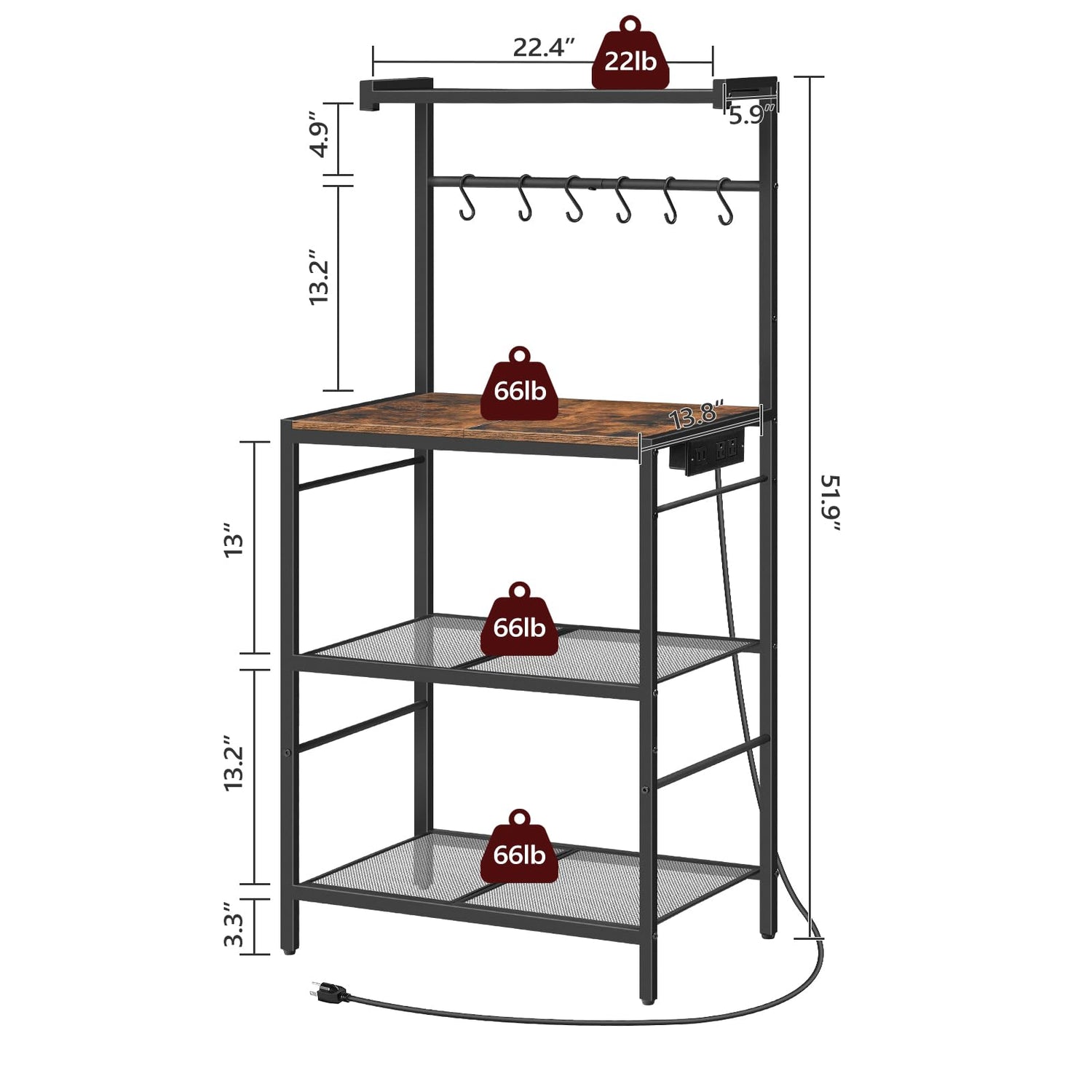 MAHANCRIS Bakers Rack with Charging Station, Microwave Stand with 6 S-Shaped Hooks, 4-Tier Storage Rack, Practical Coffee Bar, for Kitchen, Dining Room, Rustic Brown BRHR35E01