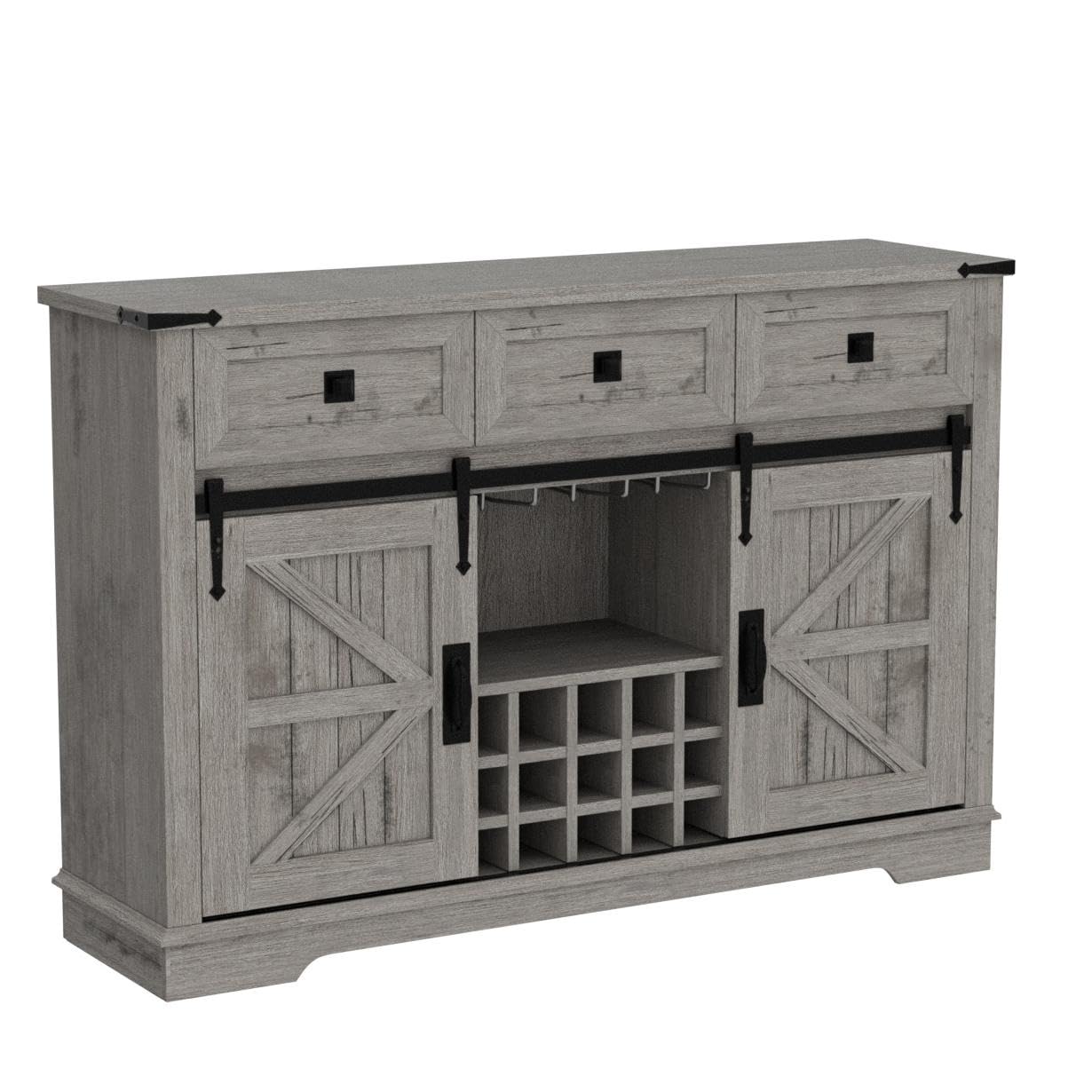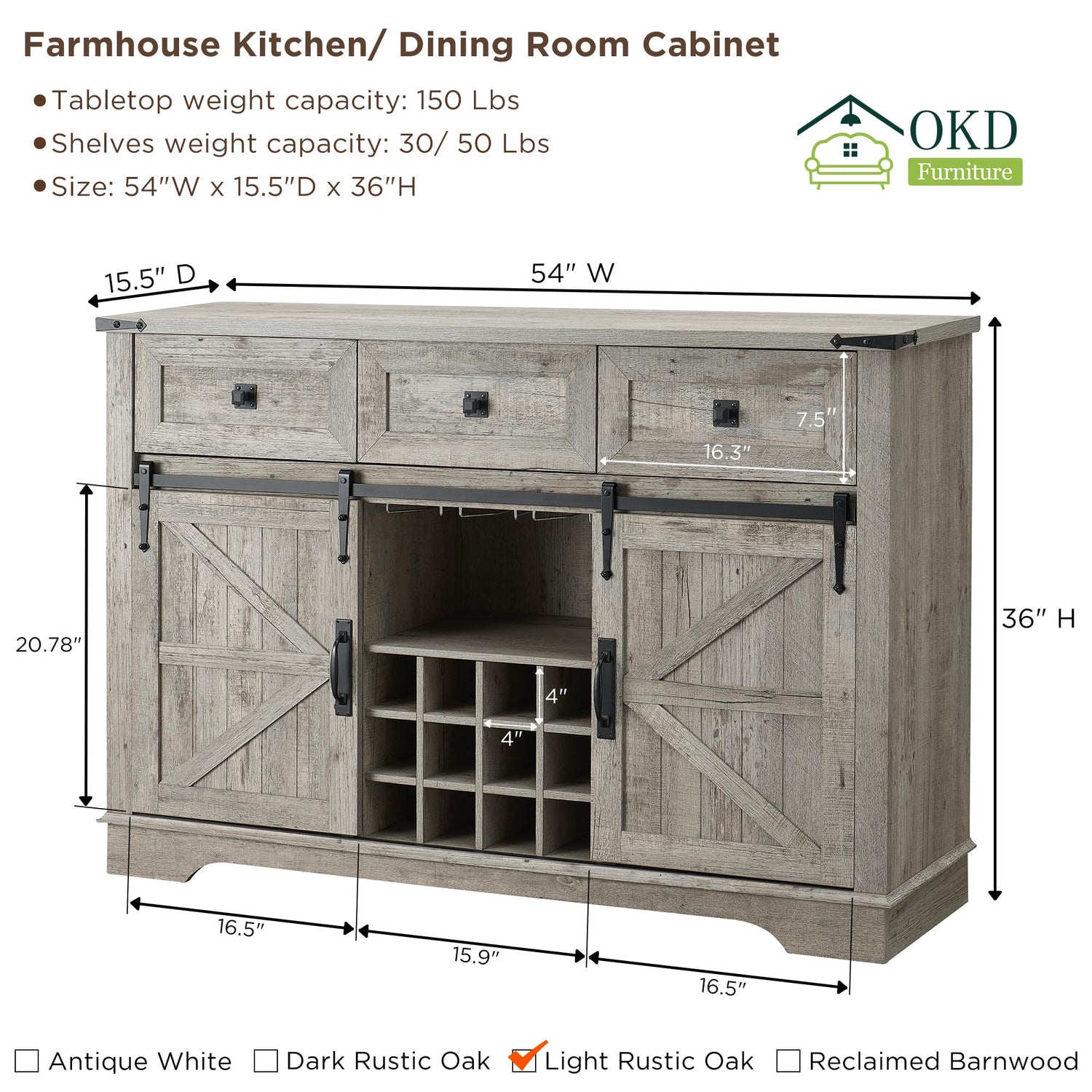 OKD Farmhouse Buffet Cabinet with Storage, 54" Kitchen Wine Bar Cabinet w/Wine & Glass Rack, Sliding Barn Door, 3 Drawers, Rustic Coffee Bar Cabinet, Light Rustic Oak
