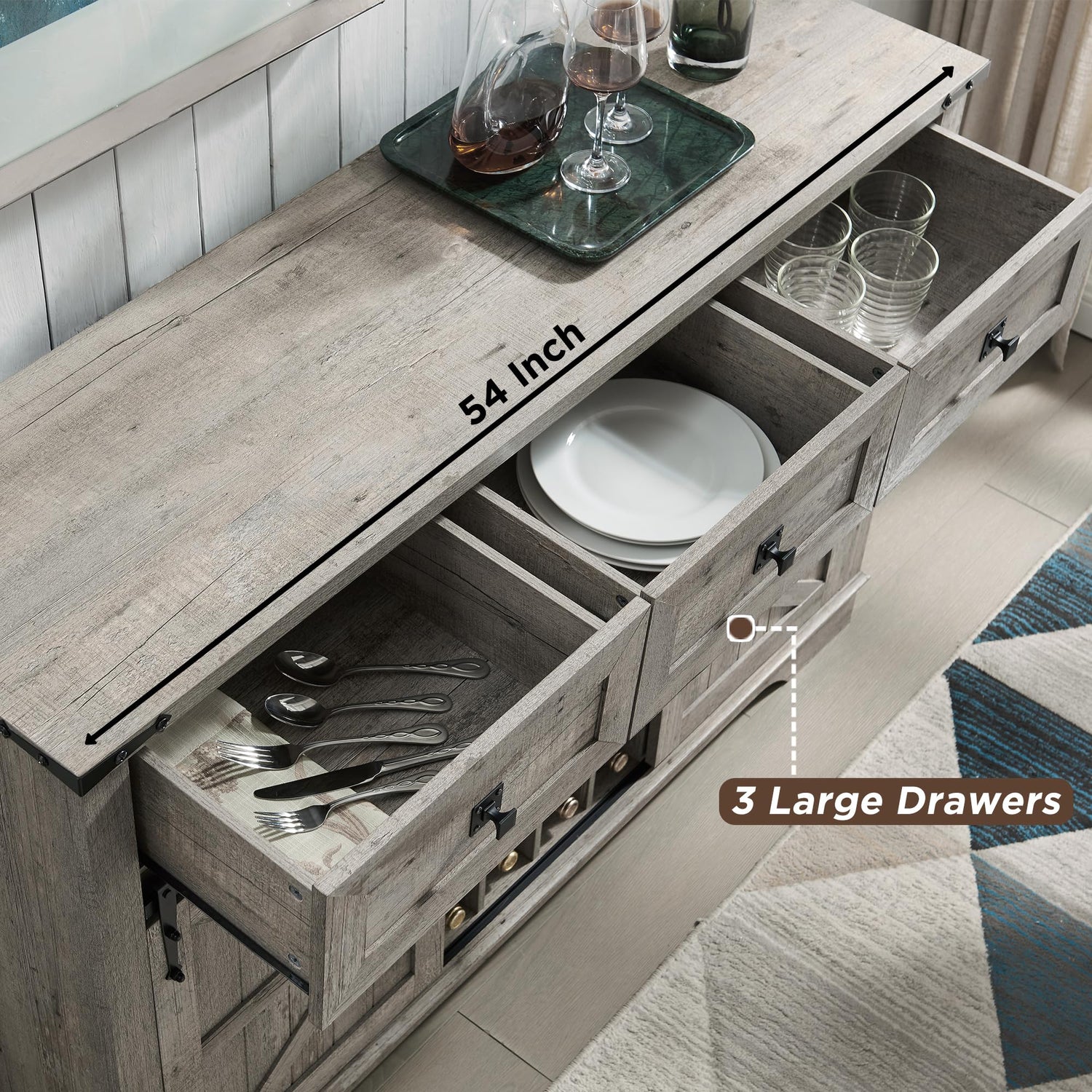 - ROOMY AND FLEXIBLE STORAGE SPACE: Comes with 6 spacious storage shelves that provide enough storage space to store your often-used items. All Shelves can be adjusted to easily store large items. 54" wide top is great for coffee maker, microwave oven, and so on. Moreover, 3 drawers can store the utensils and dinnerware to avoid dust, 12 wine bottles and 3 row glass slots can satisfy your wine liquor collection needs well. Ideally adapt for any place such as living room, dining room, kitchen.