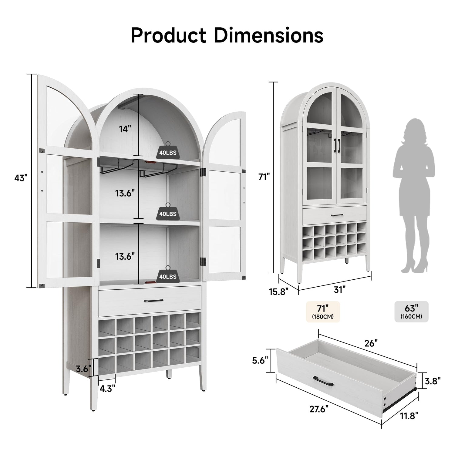ONBRILL 71" Tall Wine Bar Cabinet, Arched Storage Cabinets with Door, Whiskey Station with Wine Rack and Glass Holder, Liquor Bar Cabinet for Home Kitchen Living Dining Room (Off White)