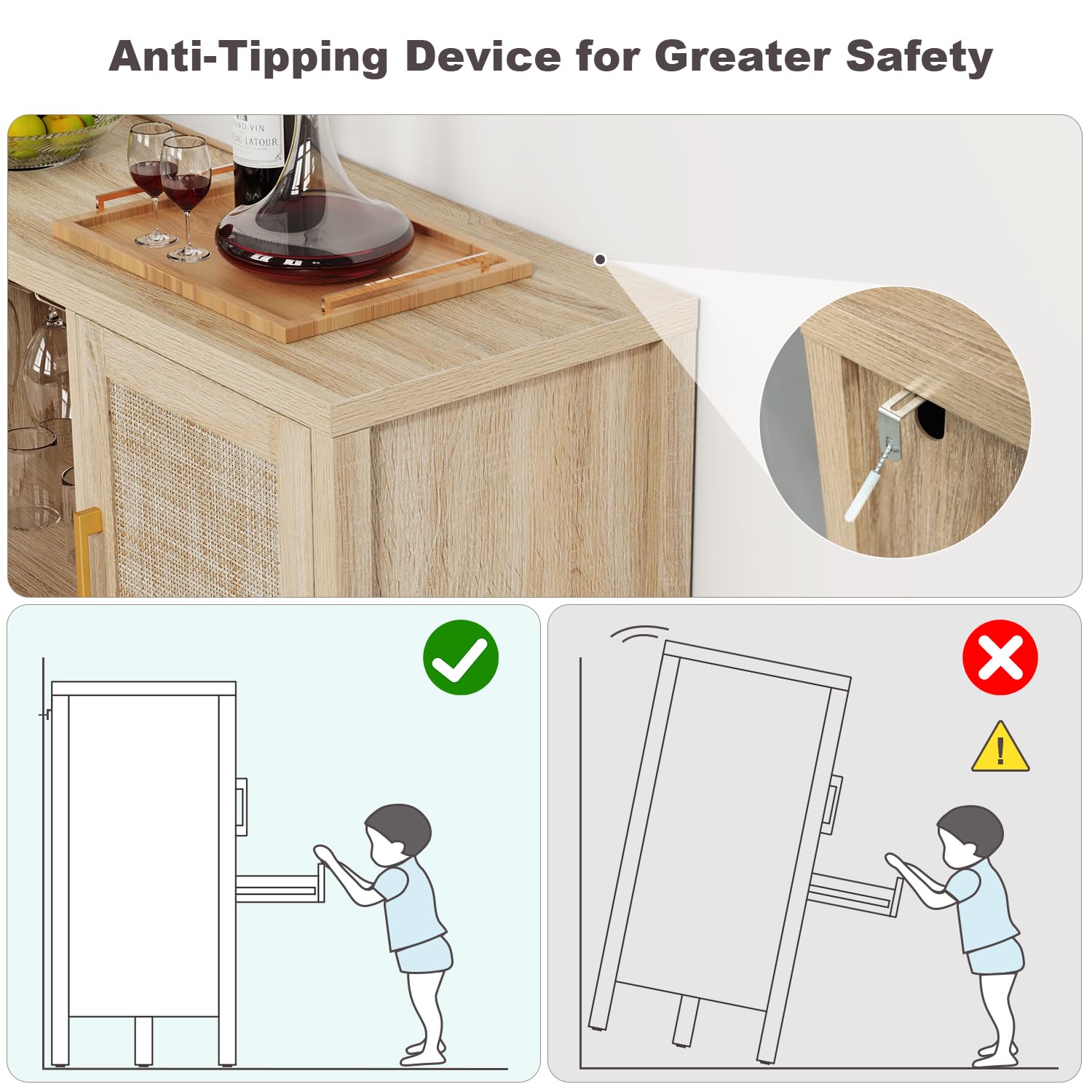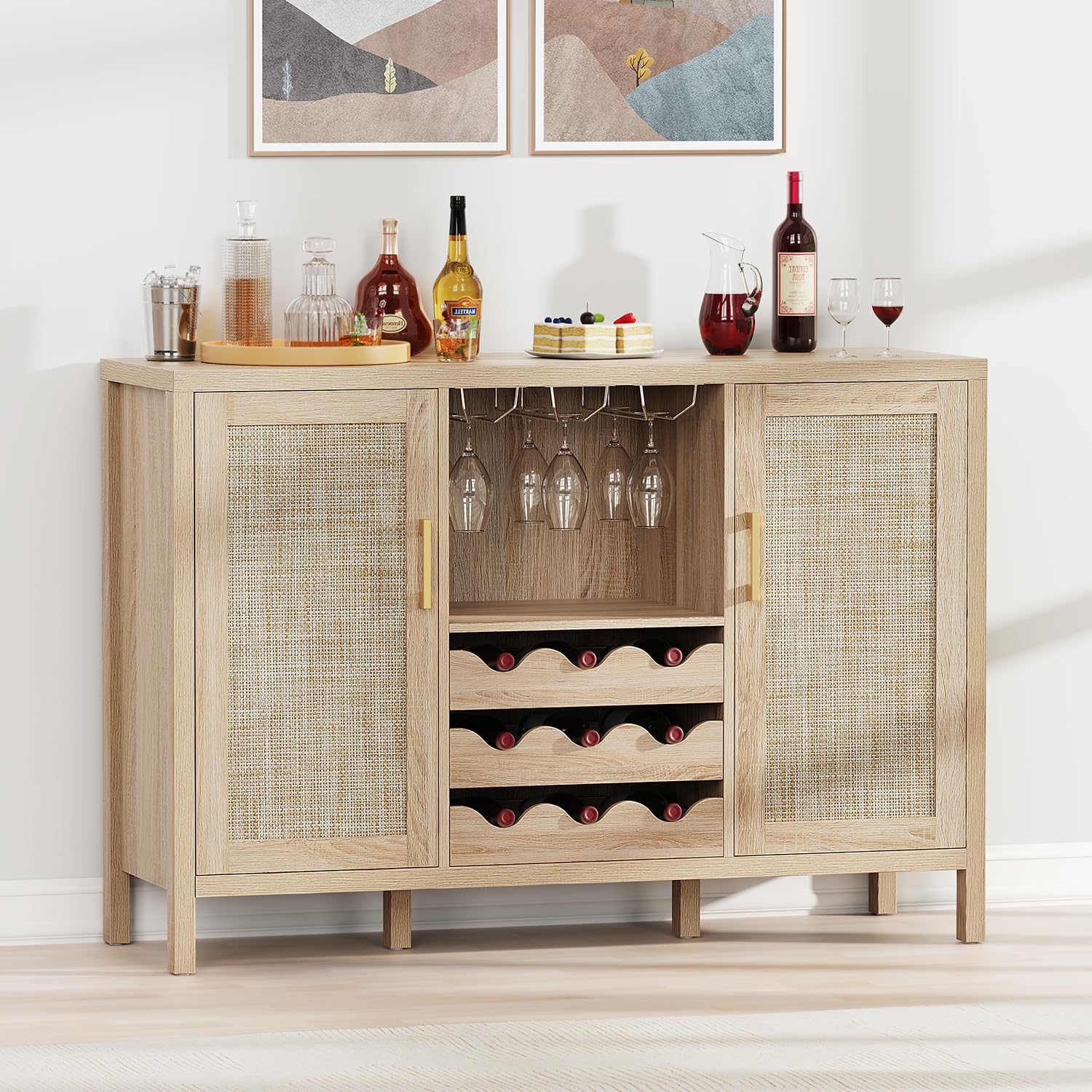 OTUTUMUS Rattan Wine Bar Cabinet, Boho Rattan Home Wine Bar Cabinet with Glass Holder and Drawer Style Wine Racks, Oak Sideboard Buffet Storage Cabinet for Living Dining Room Kitchen