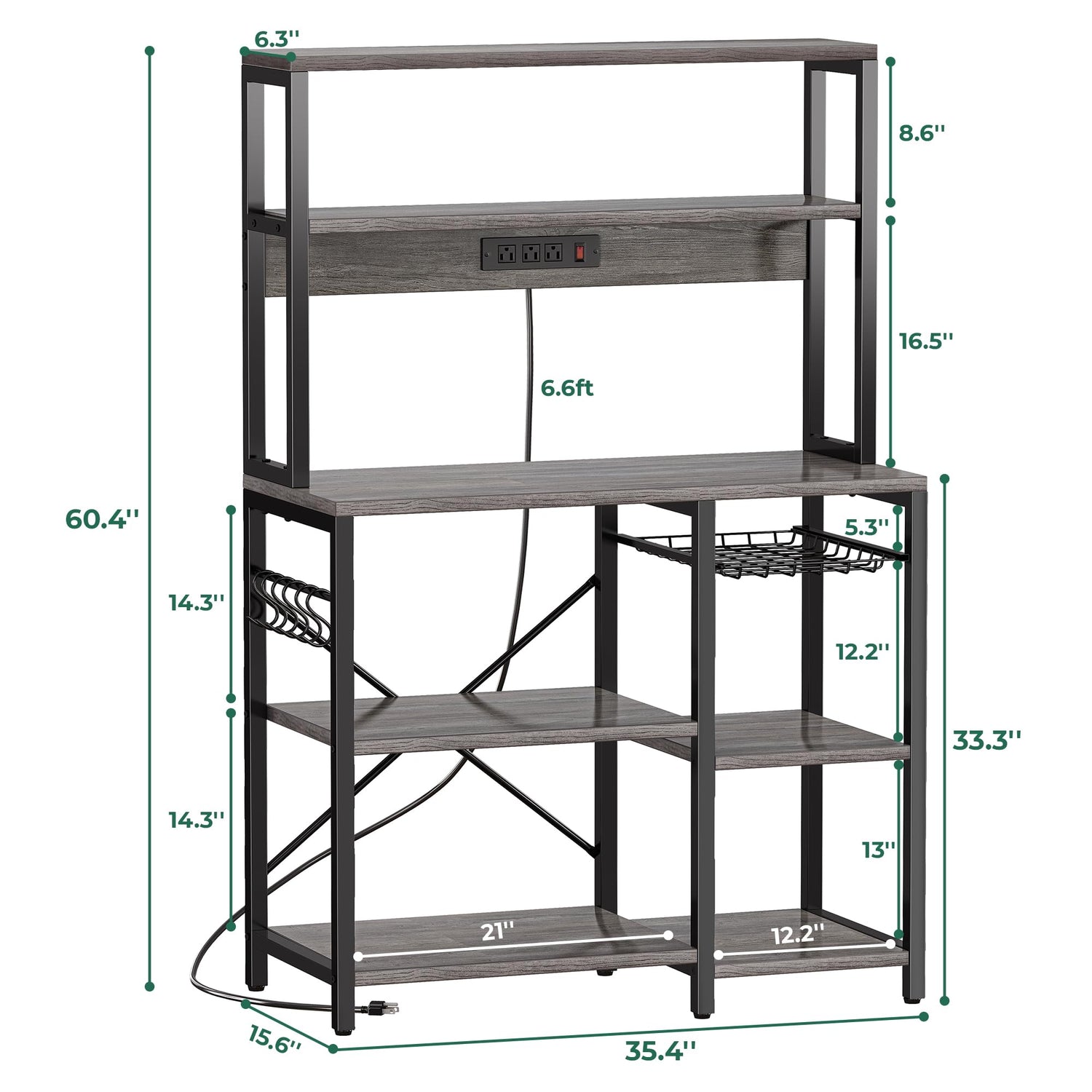 SUPERJARE Bakers Rack with Power Outlet, 35.4 Inches Coffee Bar with Wire Basket, Kitchen Microwave Stand with 6 S-Shaped Hooks, Open Storage Shelves, Charcoal Gray