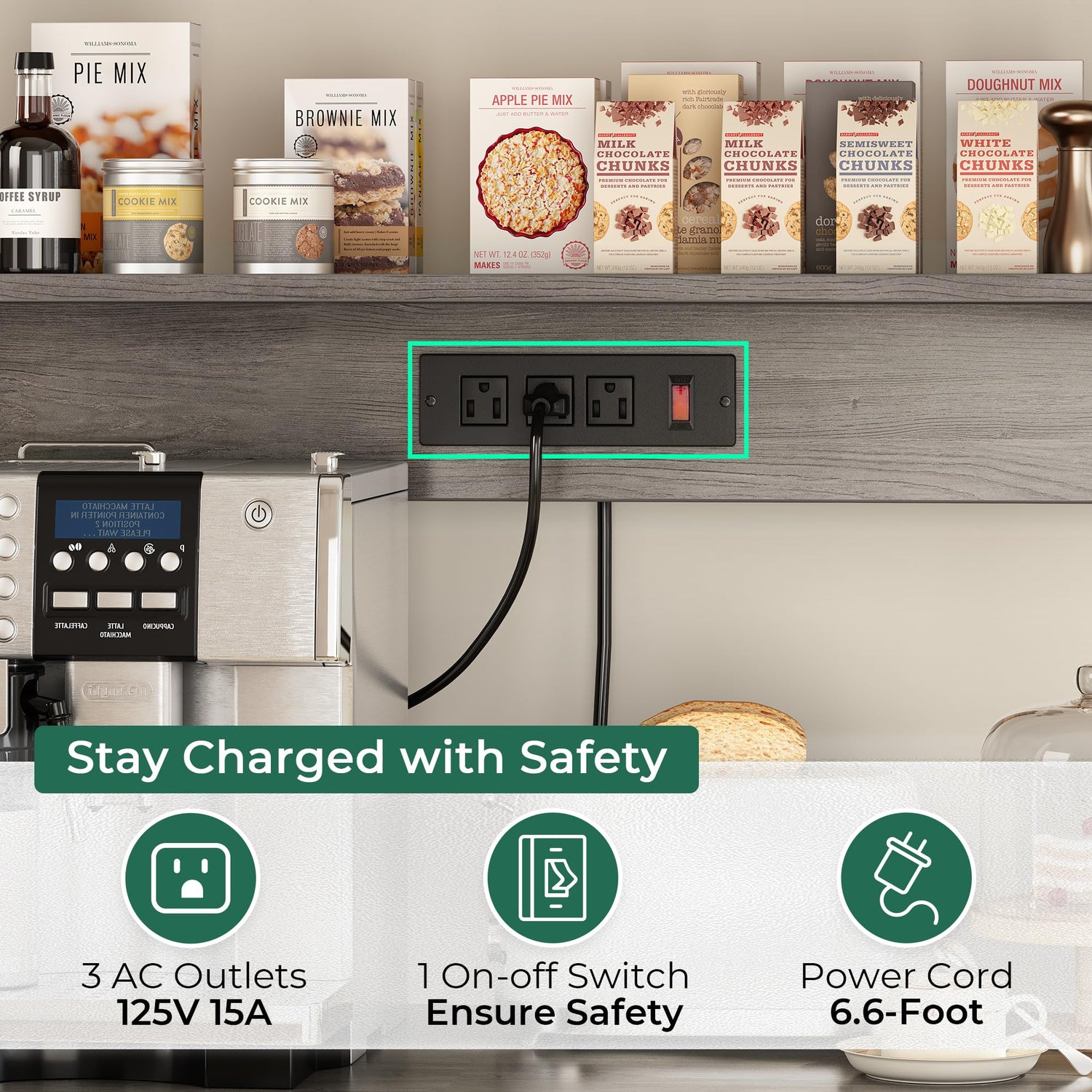 - 【3 AC Outlets & 1 On-off Switch】 Delight baking enthusiasts or coffee lovers in no time with a power strip built into the kitchen shelf rack! Plug in your kitchen supplies within reach, more charging spots, and more safety with the switch off when they are not in use. All for a tidy and safe kitchen space