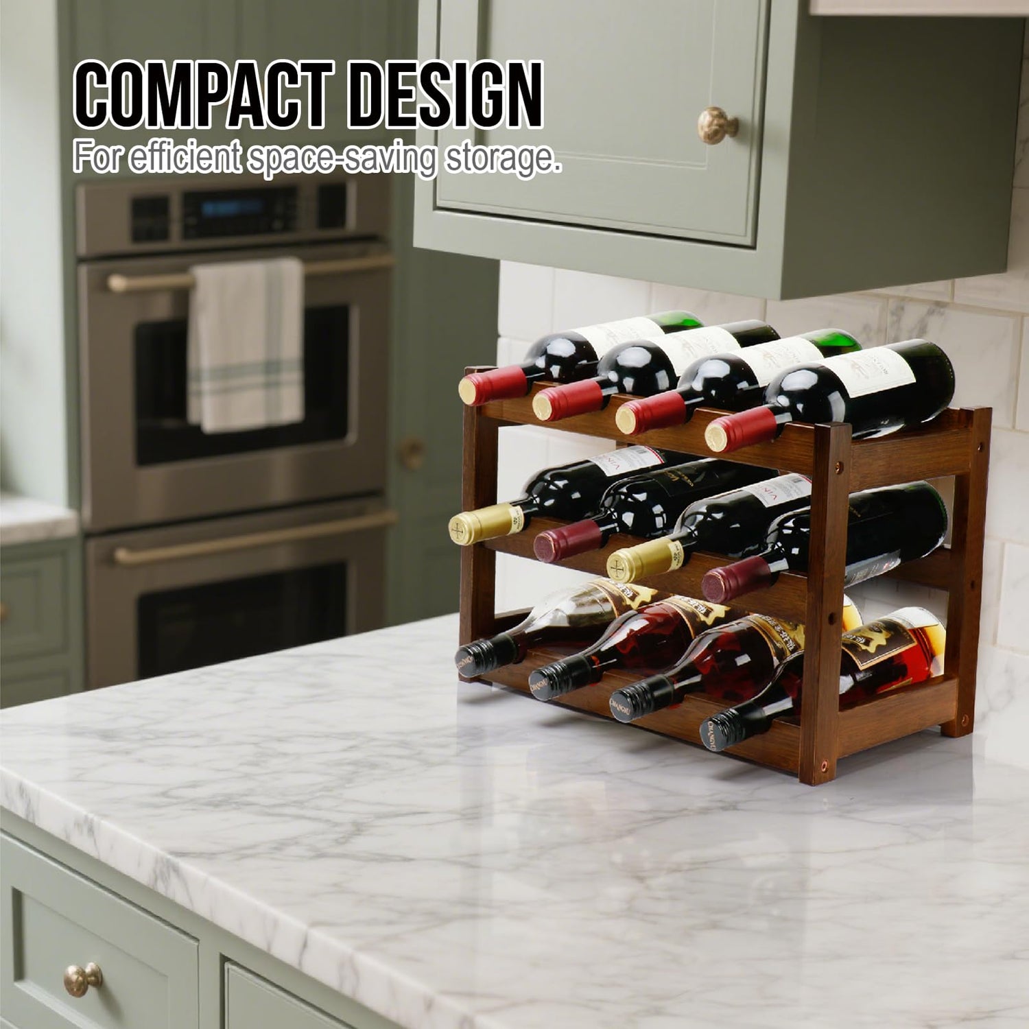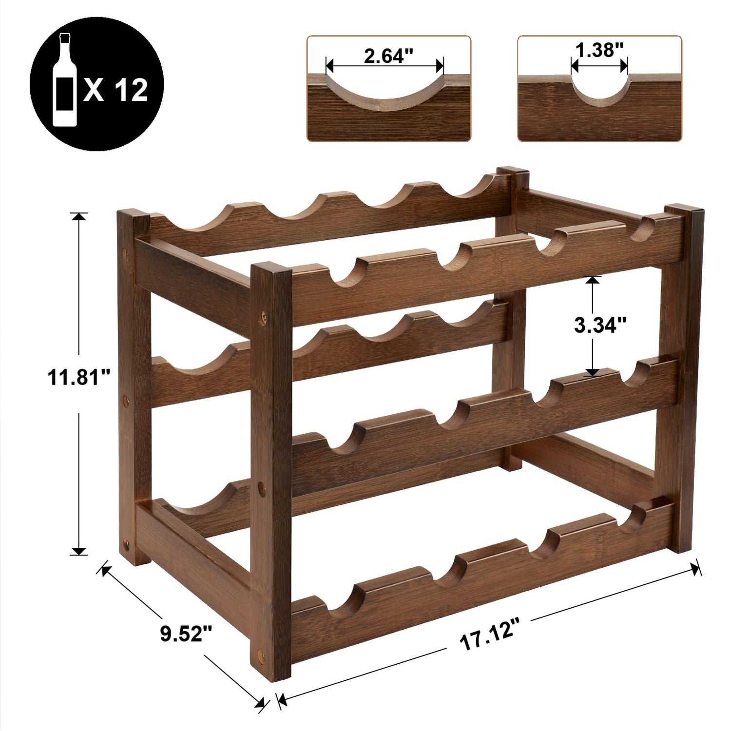 - 3-Tier wine rack: Thalomely bamboo wine rack has 3 tiers and can store 4 bottles of wine on each layer, holding up to 12 bottles securely.Clever design and sturdy construction of the freestanding wine racks prevent the wine bottles from wobbling, tilting or falling.The wine holder is suitable for most red wine, white wine, and champagne.