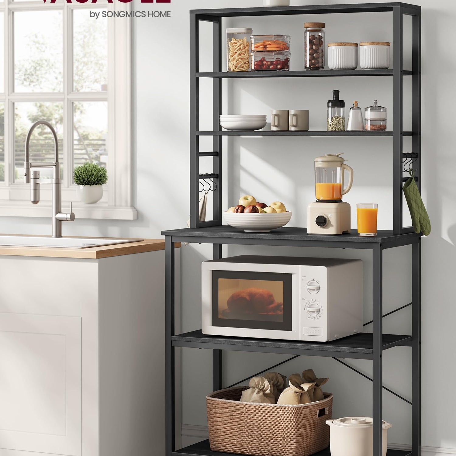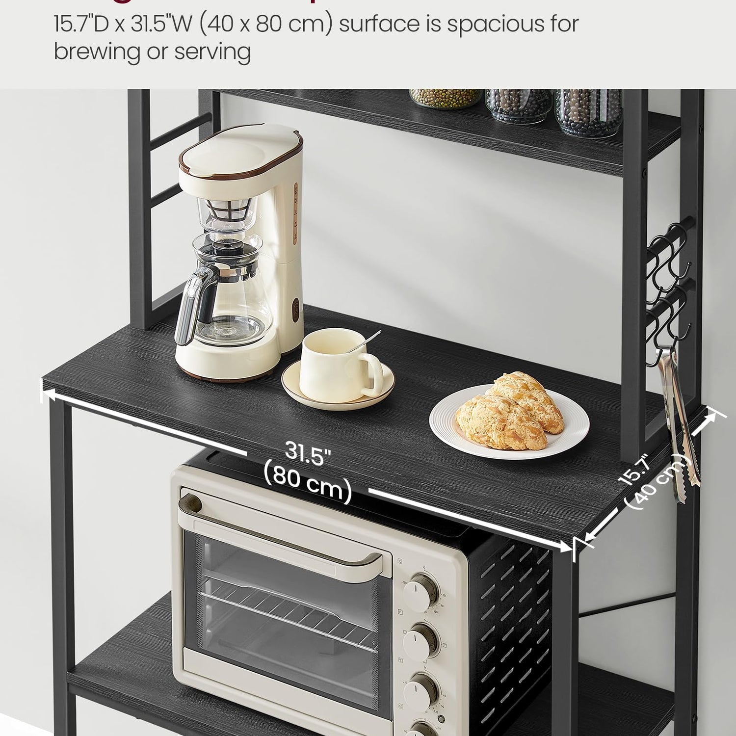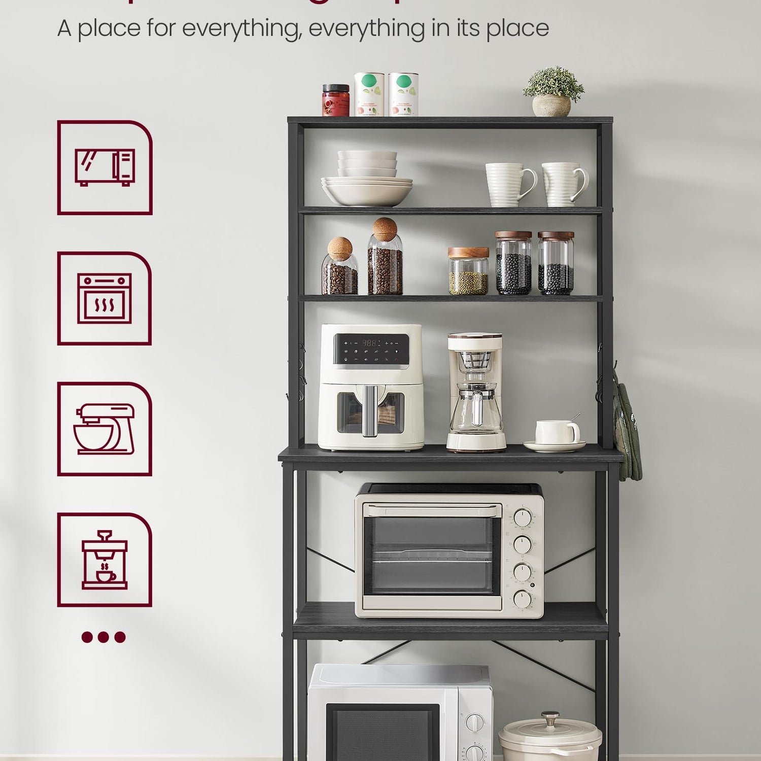 VASAGLE Coffee Bar, 31.5 Inches Baker's Rack for Kitchen with Storage, 6-Tier Kitchen Shelves with 6 Hooks, Microwave Stand, Industrial, Charcoal Gray and Black UKKS019B22