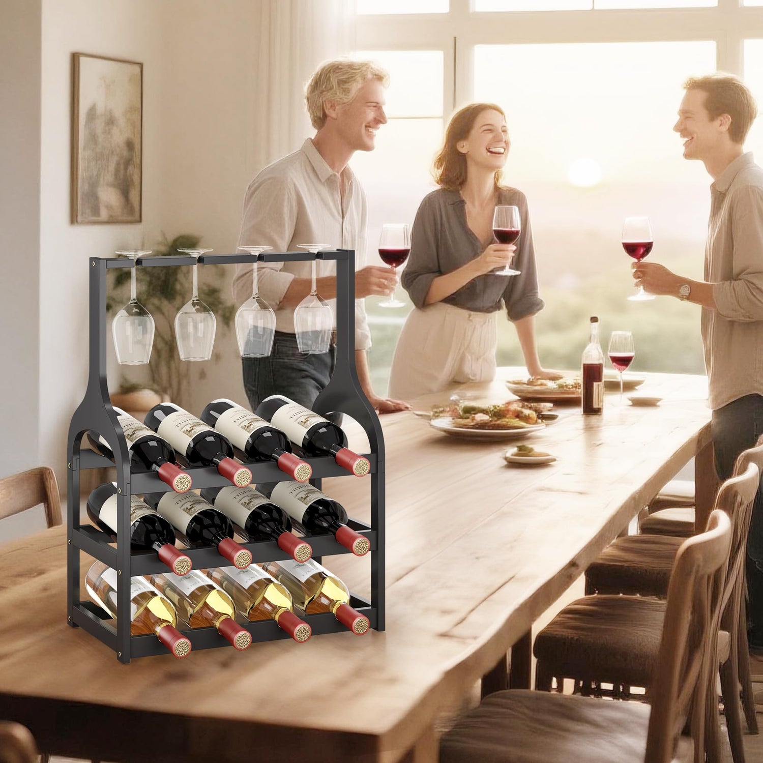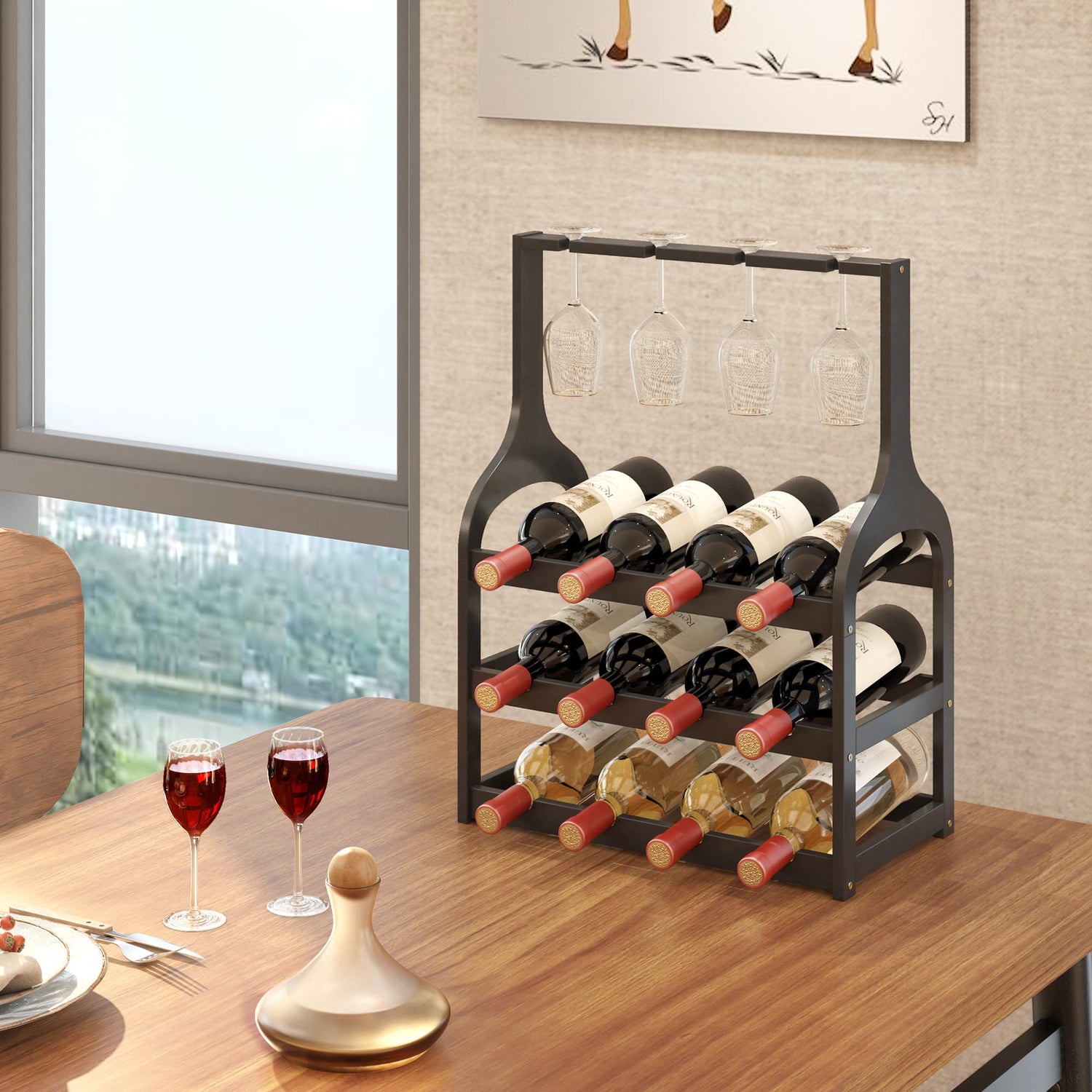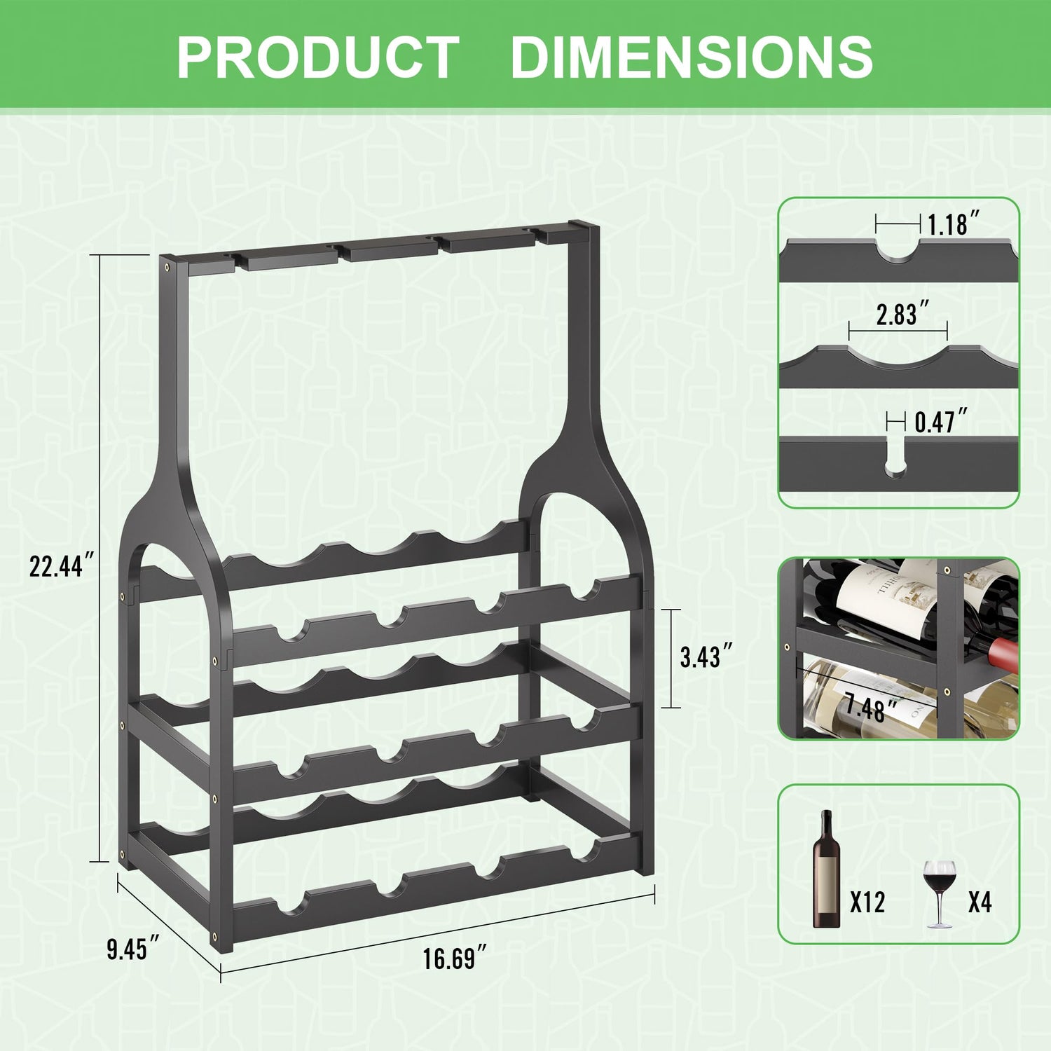 - 【Holds 12 Bottles & 4 Glasses】: Spacious design (16.69"L x 9.45"W x 22.44"H) stores 12 standard 750ml bottles and 4 wine glasses in dedicated upper slots for convenient access and display. fitting 90% of market sizes—ideal for collectors and beginners, Suitable for most red wine, white wine, champagne, catering to both seasoned collectors and those just starting their wine journey