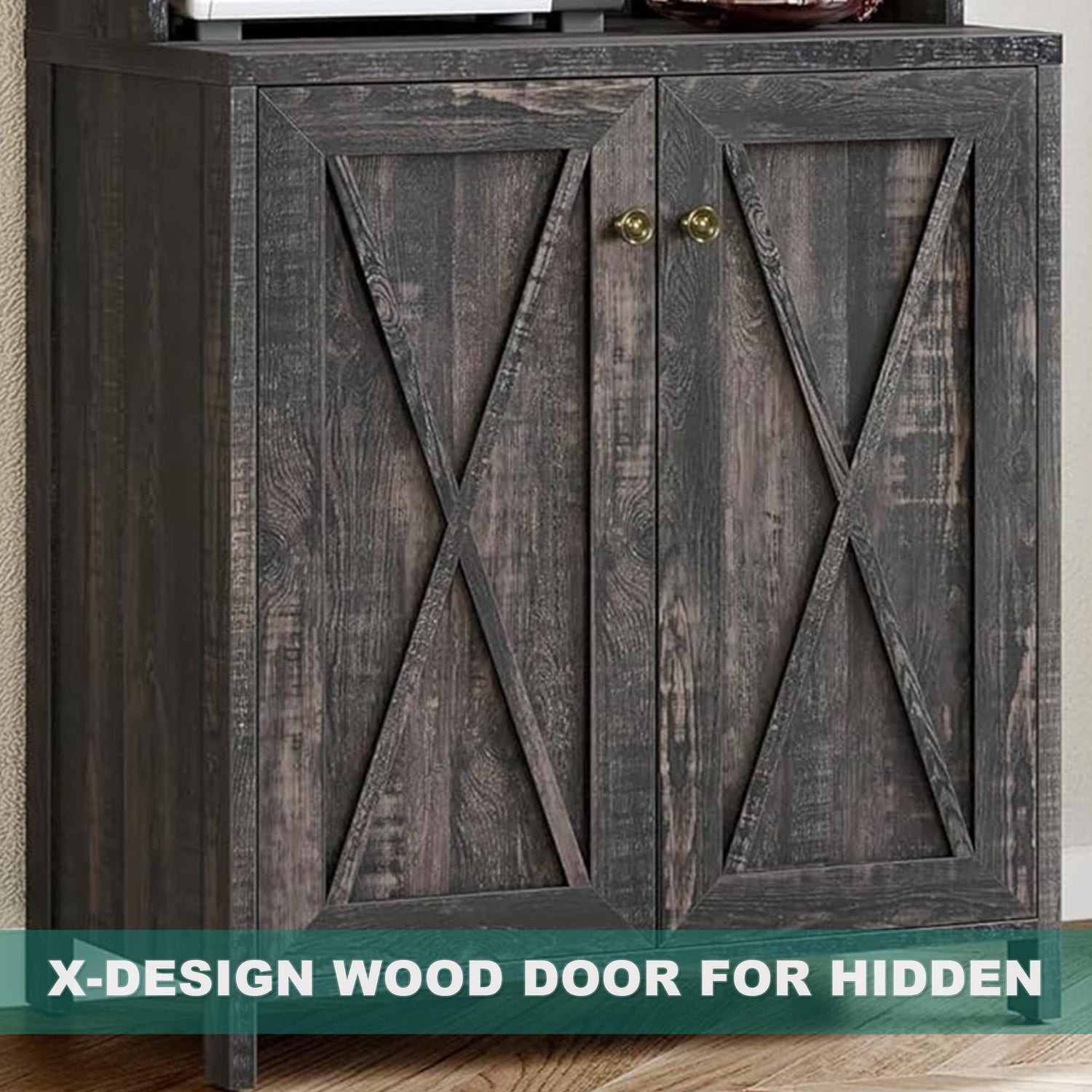 - Retro Industrial Design: Besides maximizing your living space, this bar cabinet with a rustic dark gray finish, round industrial metal handle and upper glass door, which add an rustic style to your home. Stylish X pattern makes your room full of farmhouse and innovative beauty.
