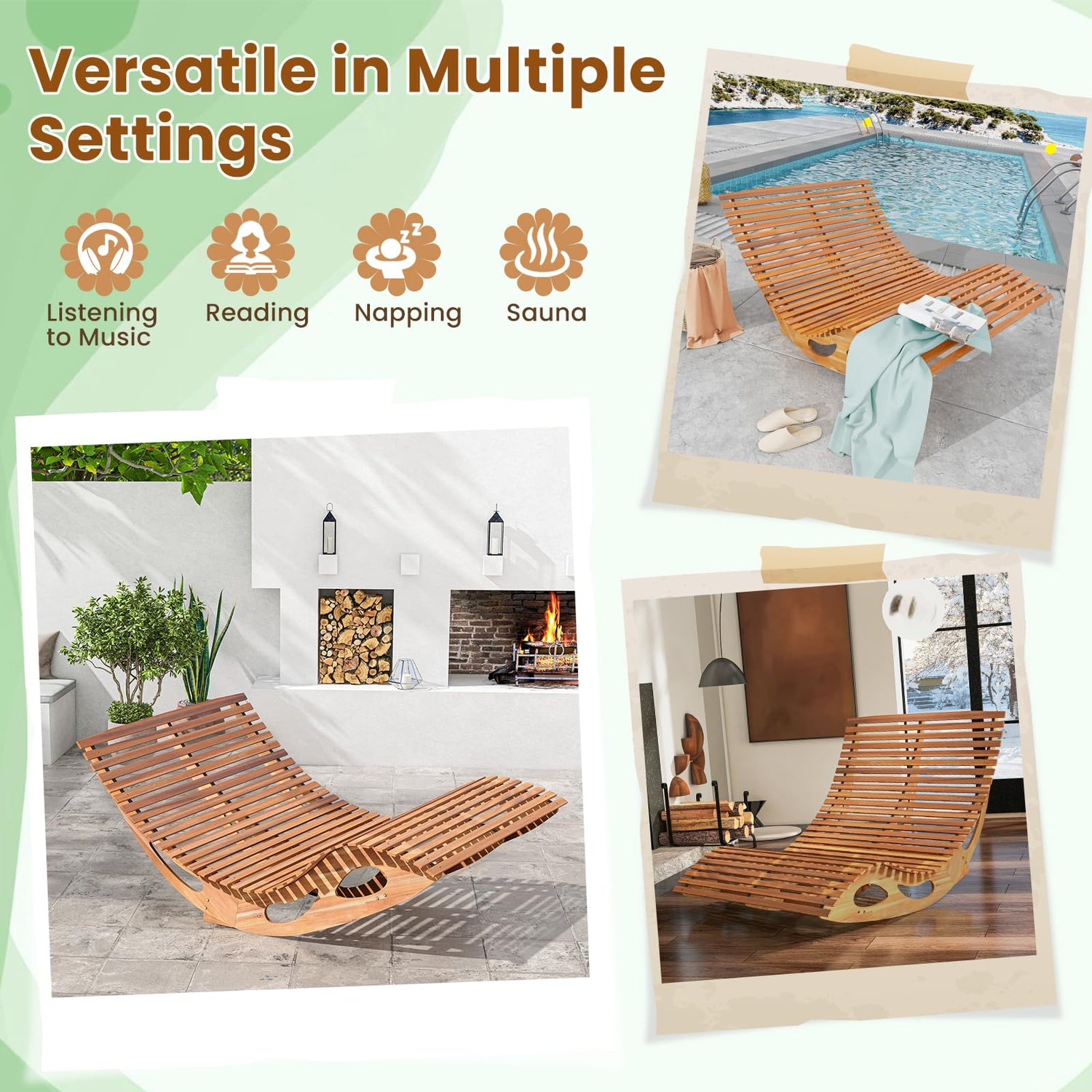 - Natural Acacia Wood: Crafted from solid acacia wood, our rocking chaise lounge provides a robust support of up to 440 lbs/220 kg, and is resistant to wear and fading for years of relaxation. Its splinter-free surface offers a pleasant touch, minimizing the risk of accidents.