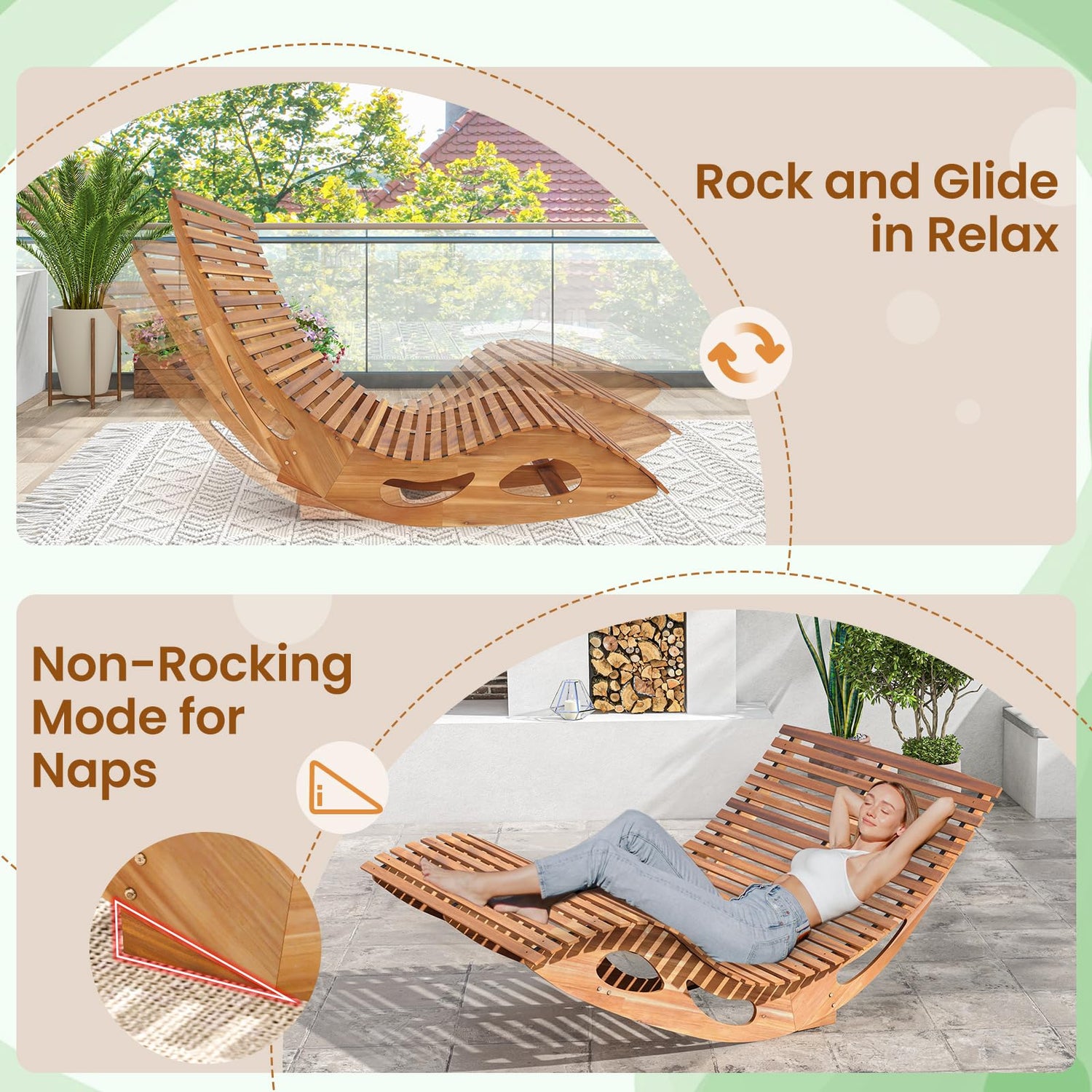 Rock and glide in relax with our outdoor chaise lounge, expertly crafted from solid, splinter-free acacia wood. The ergonomic S-shaped seat and tall backrest provide maximum support for a wide range of postures, while the slatted seat design promotes ventilation for use in hot summer days. When stability is needed, you can keep the chair stationary with the stopper at its bottom. With its warm tone and elegant design, this rocking lounge chair effortlessly enhances any outdoor setting, from patios to poolside, adding a touch of timeless natural beauty.
