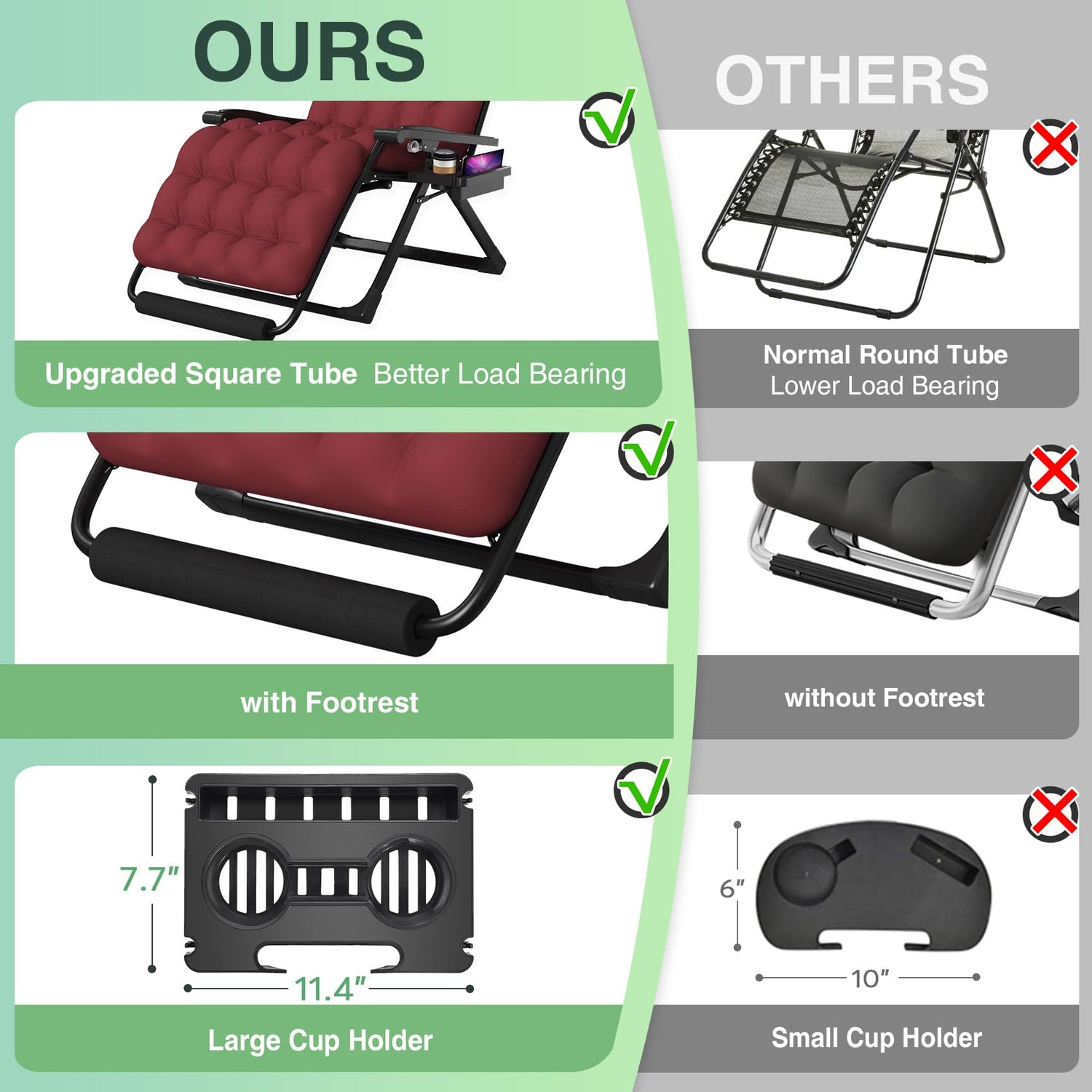 - 【More Sturdy and Durable】Upgraded zero gravity chair can bear 500 pounds. 40mm(1.6inch) Thickened steel pipe can make the chair not shake and more stable, improve the bearing capacity and durability of the patio chair. Upgrade texlin fabric, double elastic bands,breathable mesh and removable soft cushions add extra comfort