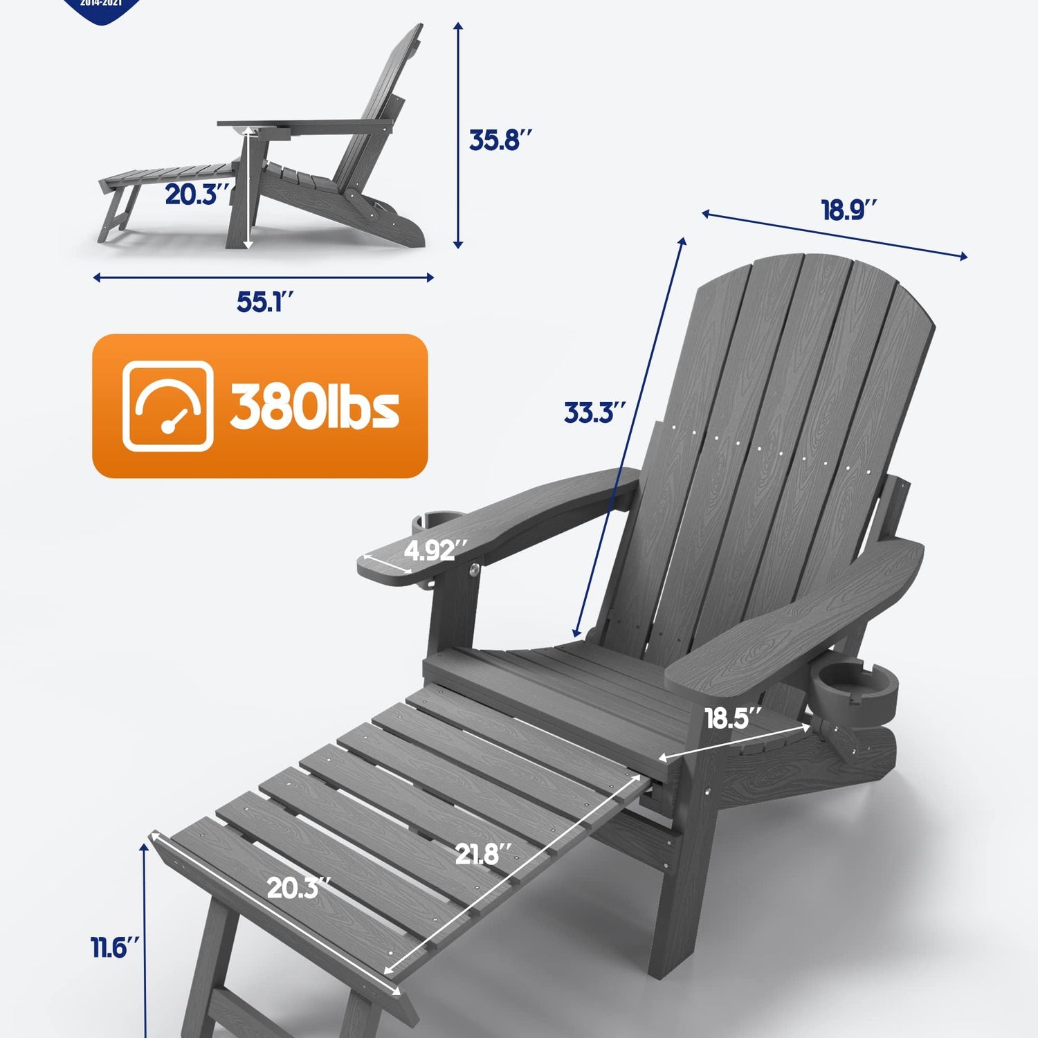 • All-Weather and Multi-Purpose: Weatherproof, weather resistant and it can withstand the test of time. You can place your adirondack chair with retractable ottoman in any outdoor, patio, garden, pool balcony or beach in any season without worrying about the weather.