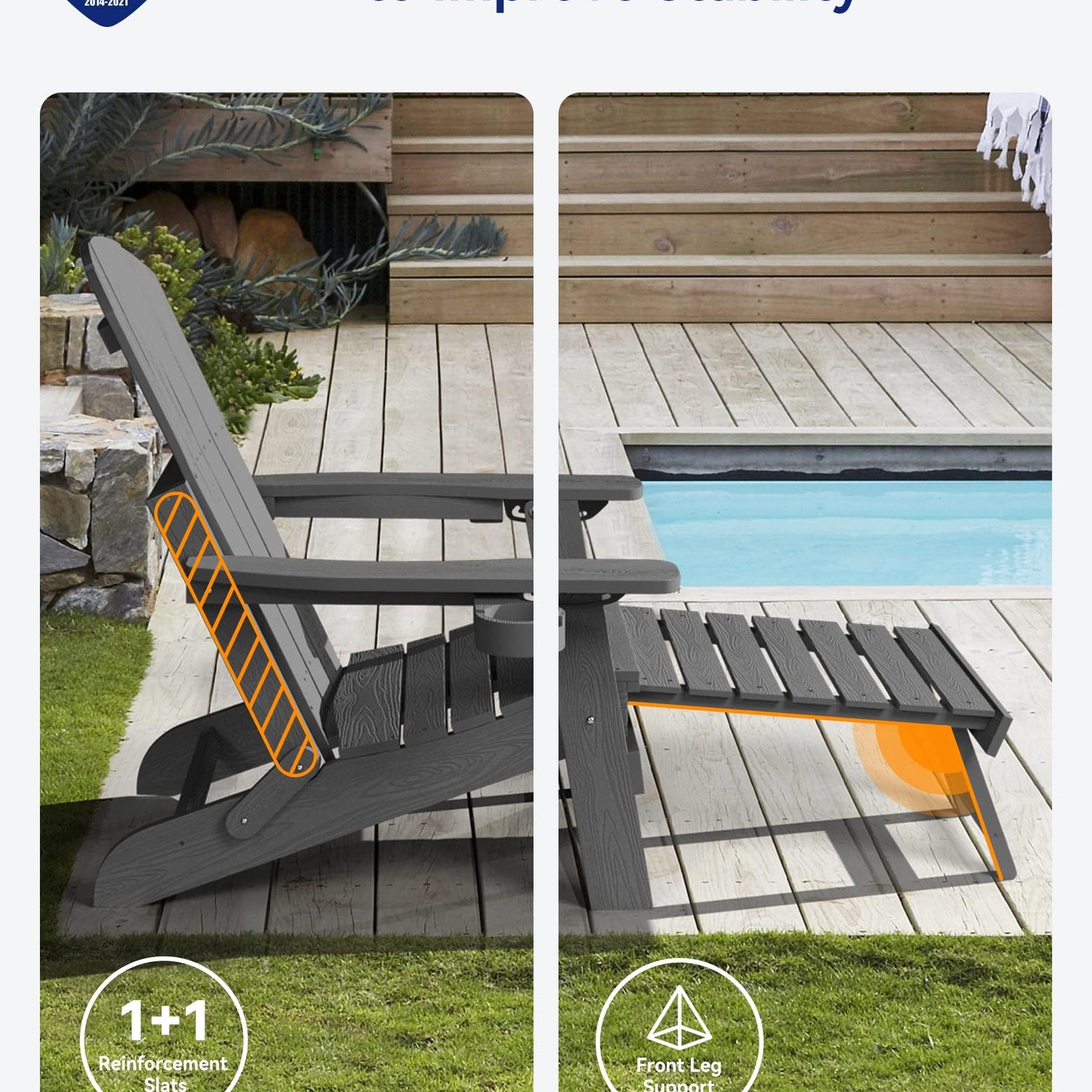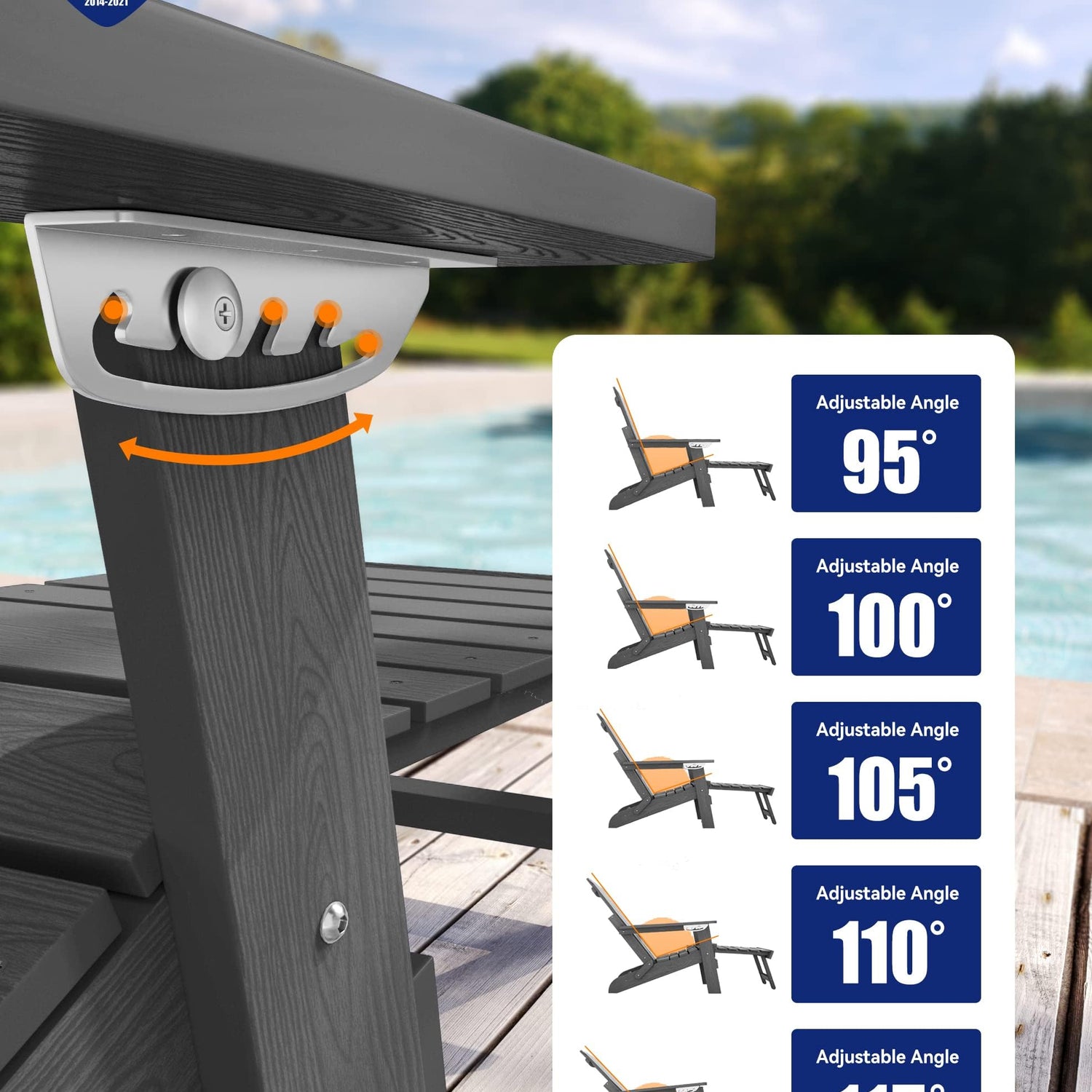 Details: All Weather Folding Adirondack chair with ottoman are more resistant outdoors! Adirondack chairs plastic is easier to maintain than nature wood chairs. Through the scientific ratio of HIPS and years of production summary, the use of high-quality 304 raw materials so that accessories metal do not rust! It does not fade for 3 years outdoor experimental testing in harsh environment. This poly lumber aderonideck chair can withstand the giant winds on the spring deck ,and the rain in the summer large patio, the salt spray aside the beach, even the ice and snow of Alaska. Easier to clean than wood, they adapt to the outdoor like a pine tree , don't rot. Insects and animals don't love them.