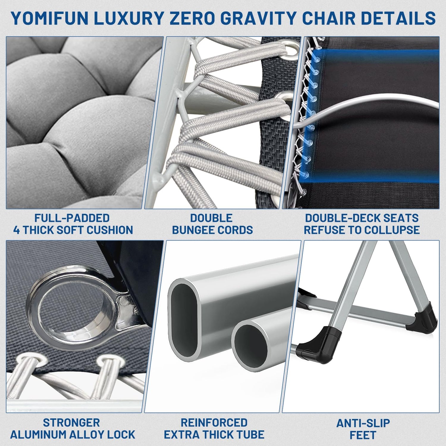 - Premium full set of accessories: The YOMIFUN Zero Gravity Chair ensures your utmost convenience and ultimate comfort. Including 1 heavy duty chair storage bag, 1 soft padded cushion, 1 comfort footrest cushion, 1 cup holder, 1 eye mask, and 1 pair of earplugs, guaranteeing a heightened sense of luxury and ease.