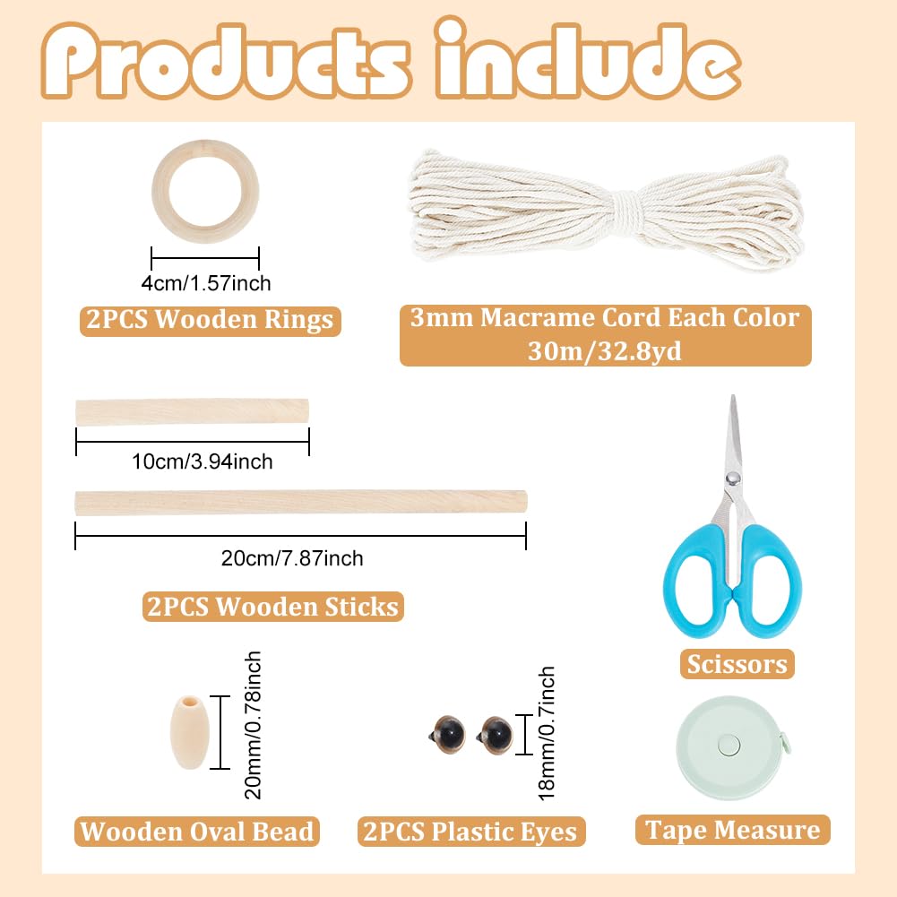 - Package Includes: You will receive 2 x wooden rings, 2 x wooden sticks, 2 x plastic eyes, 1 x wooden bead, 1 x 30m beige cotton thread, 1 x storage box, 1 x scissors, 1 x measuring tape, 1 x English instruction. The macrame kits include everything you need to make a owl macrame wall hanging.